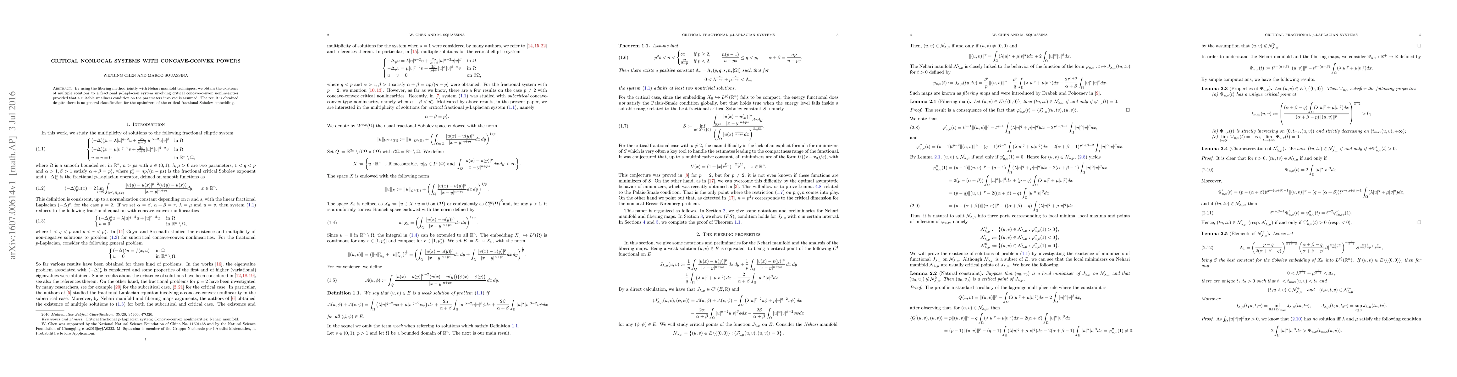 Summary: This paper utilizes the fibering method and Nehari manifold techniques to establish the existence of multiple solutions for a fractional $p$-Laplacian system with critical concave-convex nonlinearities, under a smallness condition on parameters, despite the lack of a general classification for the critical fractional Sobolev embedding optimizers.