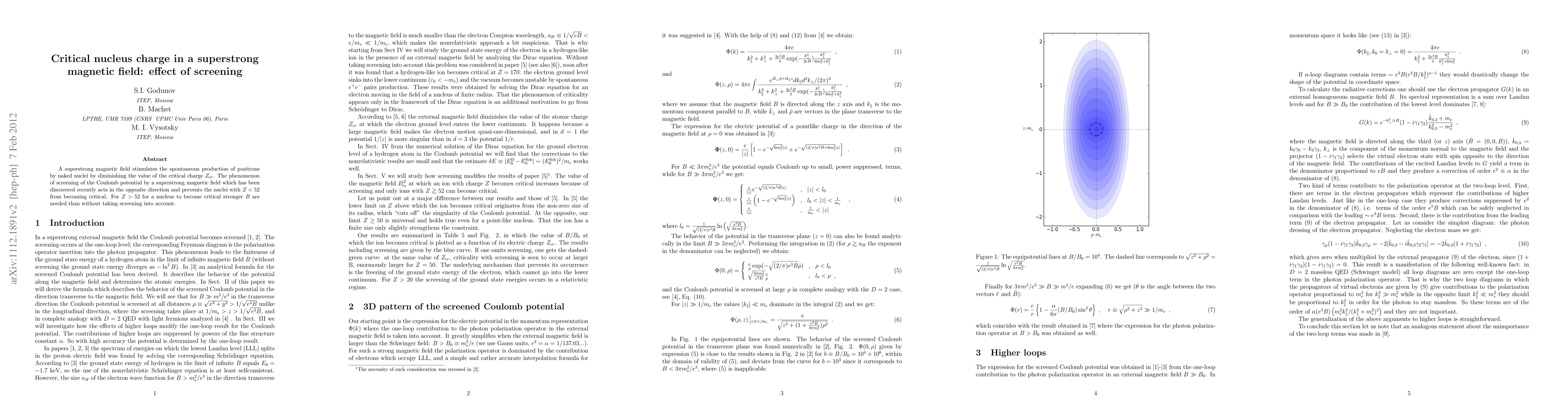 Summary: This paper investigates how a superstrong magnetic field reduces the critical charge Z_{cr} for spontaneous positron production by naked nuclei, while screening effects counteract this for nuclei with Z<52. For nuclei with Z>52, stronger magnetic fields are required to achieve criticality when screening is considered.