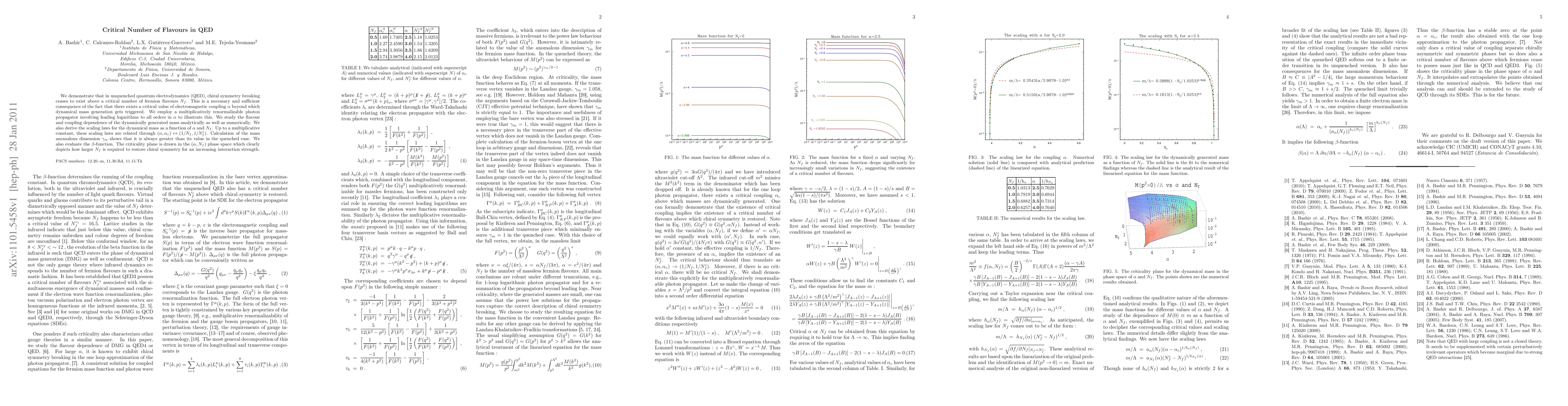This paper demonstrates that in unquenched QED, chiral symmetry breaking ceases above a critical number of fermion flavours $N_f$, linked to a critical electromagnetic coupling $\alpha$ that triggers dynamical mass generation. The study reveals scaling laws and the anomalous dimension, showing that larger $N_f$ is needed to restore chiral symmetry with increasing interaction strength.