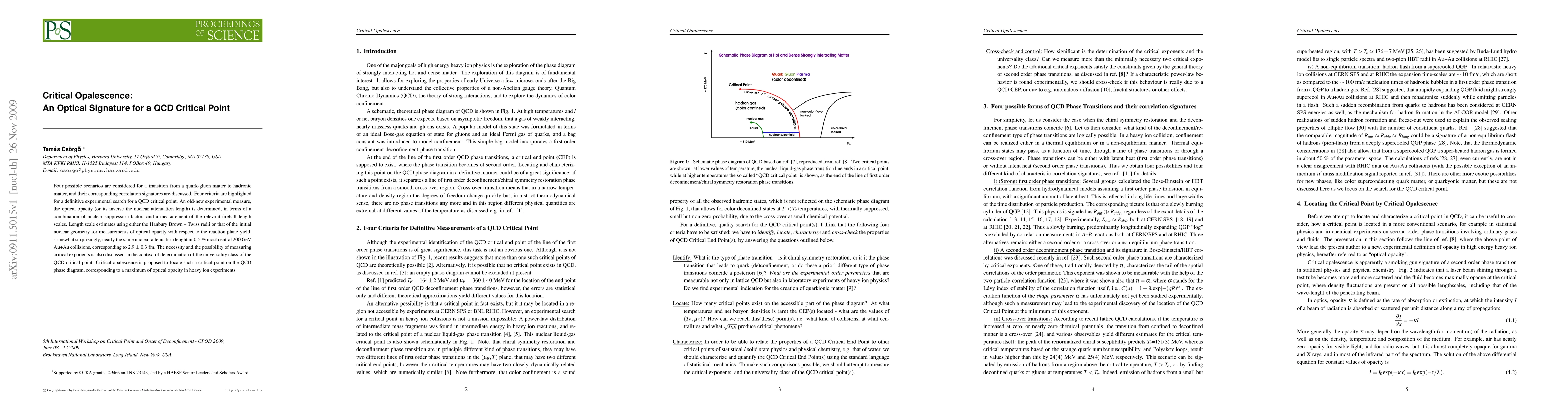 Four possible scenarios are considered for a transition from a quark-gluon matter to hadronic matter, and their corresponding correlation signatures are discussed. Four criteria are highlighted for a definitive experimental search for a QCD critical point. An old-new experimental measure, the optical opacity (or its inverse the nuclear attenuation length) is determined, in terms of a combination of nuclear suppression factors and a measurement of the relevant fireball length scales. Length scale estimates using either the Hanbury Brown -- Twiss radii or that of the initial nuclear geometry for measurements of optical opacity with respect to the reaction plane yield, somewhat surprizingly, nearly the same nuclear attenuation lenght in 0-5 % most central 200 GeV Au+Au collisions, corresponding to 2.9 $\pm$ 0.3 fm. The necessity and the possibility of measuring critical exponents is also discussed in the context of determination of the universality class of the QCD critical point. Critical opalescence is proposed to locate such a critical point on the QCD phase diagram, corresponding to a maximum of optical opacity in heavy ion experiments.