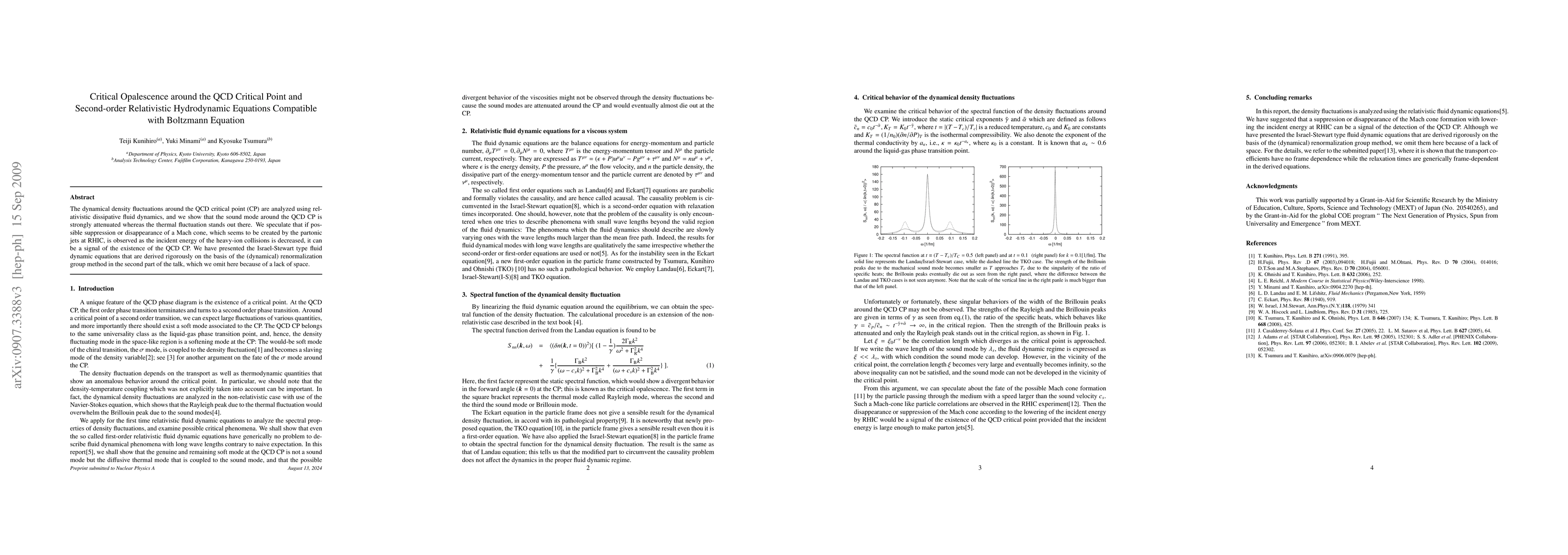 The dynamical density fluctuations around QCD critical point (CP) are analyzed using relativistic dissipative fluid dynamics, and we show that the sound mode around the QCD CP is strongly attenuated whereas the thermal fluctuation stands out there. We speculate that if possible suppression or disappearance of a Mach cone, which seems to be created by the partonic jets at RHIC, is observed as the incident energy of the heavyion collisions is decreased, it can be a signal of the existence of the QCD CP. We have presented the Israel-Stewart type fluid dynamic equations that are derived rigorously on the basis of the (dynamical) renormalization group method in the second part of the talk, which we omit here because of a lack of space.