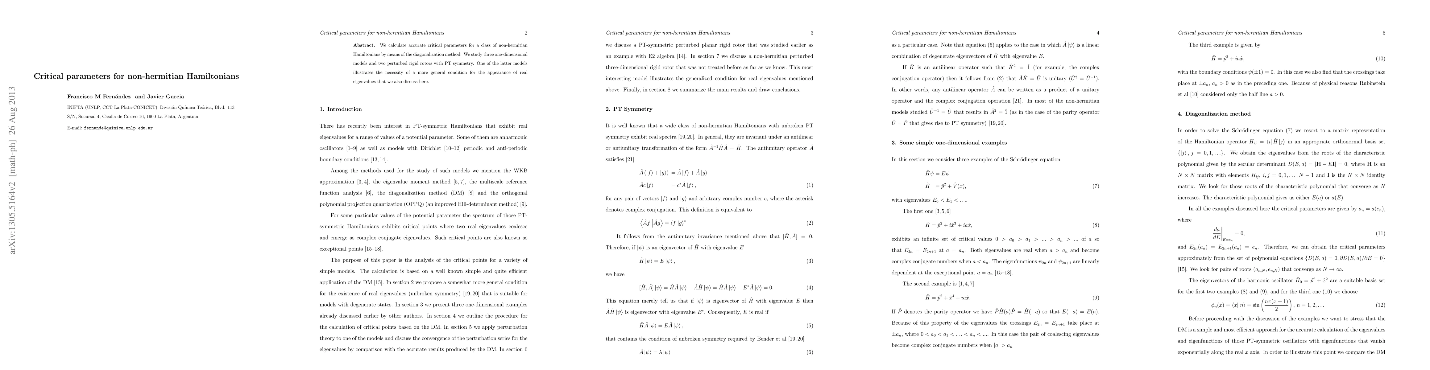 We calculate accurate critical parameters for a class of non-hermitian Hamiltonians by means of the diagonalization method. We study three one-dimensional models and two perturbed rigid rotors with PT symmetry. One of the latter models illustrates the necessity of a more general condition for the appearance of real eigenvalues that we also discuss here.
