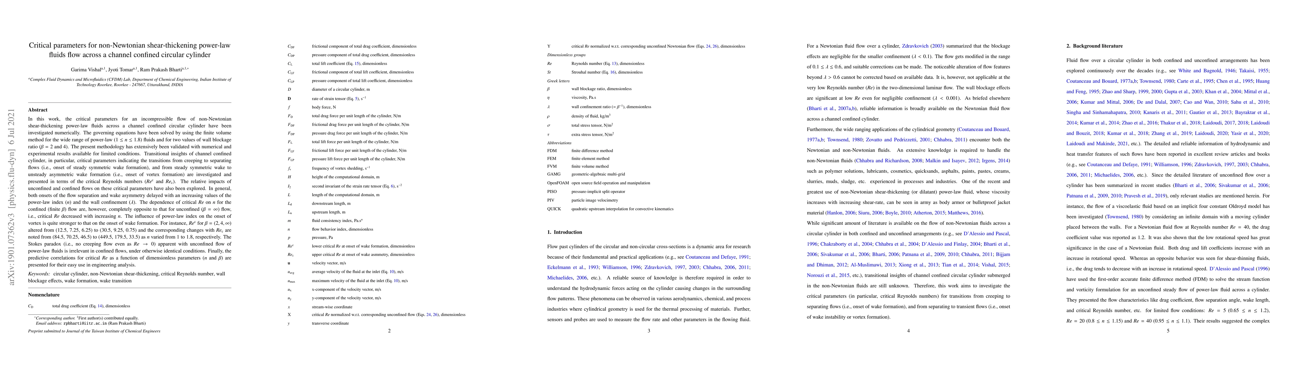 This study numerically investigates the critical parameters for incompressible shear-thickening power-law fluid flow across a channel confined by a circular cylinder, revealing how flow transitions are influenced by the power-law index and blockage ratio. Predictive correlations for critical Reynolds numbers are provided for engineering applications.