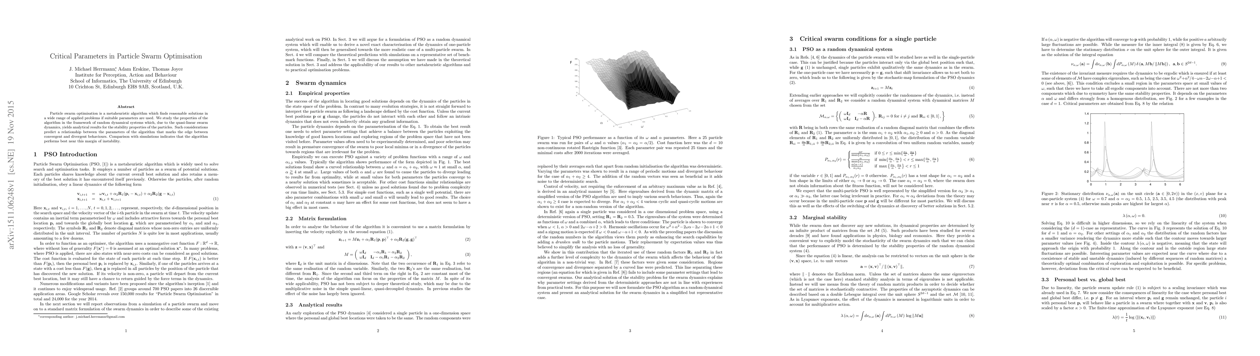 This paper investigates the critical parameters influencing the performance of particle swarm optimisation, revealing a relationship that marks the boundary between convergence and divergence. Analytical results from the framework of random dynamical systems suggest that the algorithm performs optimally near this instability threshold.