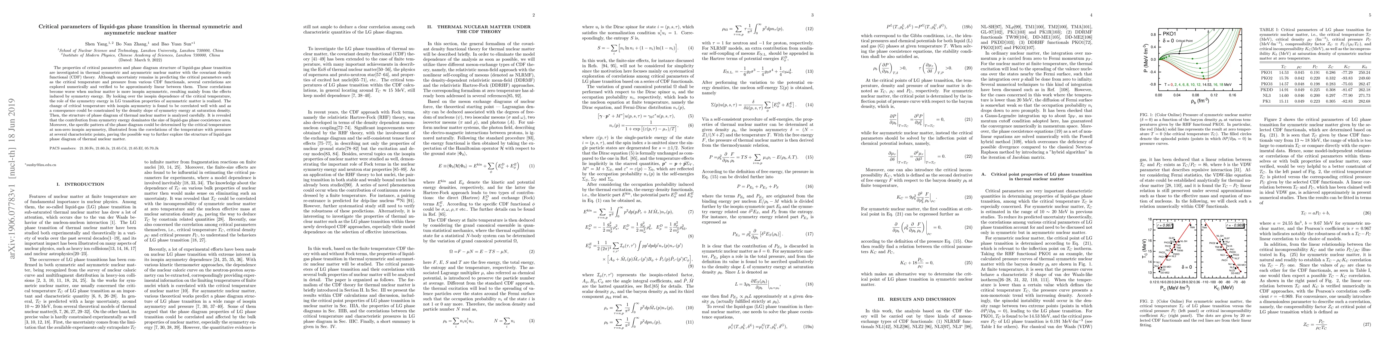 The properties of critical parameters and phase diagram structure of liquid-gas phase transition are investigated in thermal symmetric and asymmetric nuclear matter with the covariant density functional (CDF) theory. Although uncertainty remains in predicting the critical parameters such as the critical temperature and pressure from various CDF functionals, several correlations are explored numerically and verified to be approximately linear between them. These correlations become worse when nuclear matter is more isospin asymmetric, resulting mainly from the effects induced by symmetry energy. By looking over the isospin dependence of the critical temperature, the role of the symmetry energy in LG transition properties of asymmetric matter is realized. The change of critical temperature with isospin asymmetry is found to be correlated well with and as a consequence could be constrained by the density slope of symmetry energy at saturation density. Then, the structure of phase diagram of thermal nuclear matter is analyzed carefully. It is revealed that the contribution from symmetry energy dominates the size of liquid-gas phase coexistence area. Moreover, the specific pattern of the phase diagram could be determined by the critical temperature at non-zero isospin asymmetry, illustrated from the correlations of the temperature with pressures at several characteristic points, paving the possible way to further explore the structure of liquid-gas phase diagram of thermal nuclear matter.