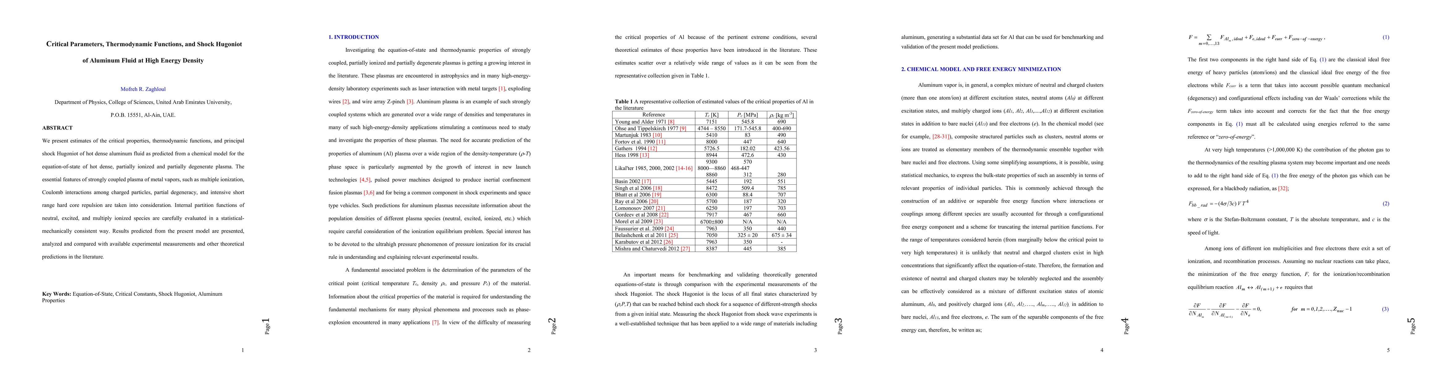 We present estimates of the critical properties, thermodynamic functions, and principal shock Hugoniot of hot dense aluminum fluid as predicted from a chemical model for the equation-of-state of hot dense, partially ionized and partially degenerate plasma. The essential features of strongly coupled plasma of metal vapors, such as multiple ionization, Coulomb interactions among charged particles, partial degeneracy, and intensive short range hard core repulsion are taken into consideration. Internal partition functions of neutral, excited, and multiply ionized species are carefully evaluated in a statistical-mechanically consistent way. Results predicted from the present model are presented, analyzed and compared with available experimental measurements and other predictions in the literature. A distinct feature of the predictions of the present model is the appearance of a third kink in the Hugoniot curve at a weaker shock strength which can be attributed to the successive ionization of the three electrons in the M shell.