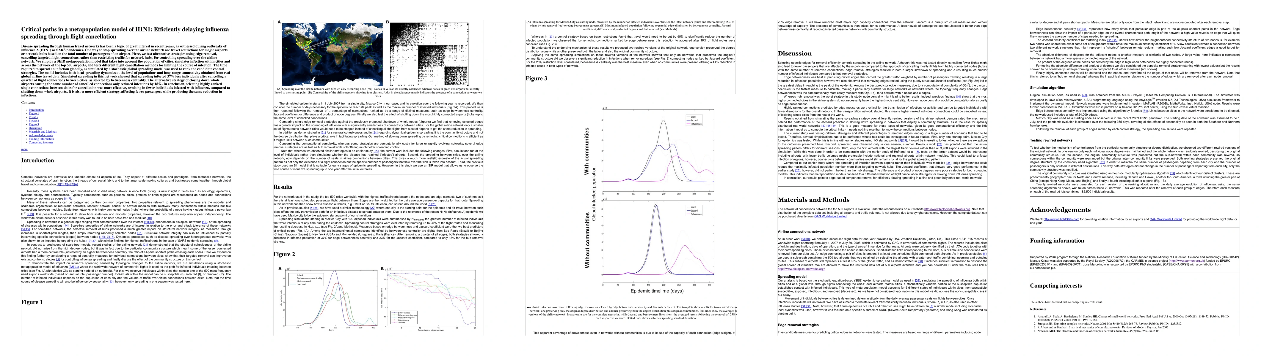 Disease spreading through human travel networks has been a topic of great interest in recent years, as witnessed during outbreaks of influenza A (H1N1) or SARS pandemics. One way to stop spreading over the airline network are travel restrictions for major airports or network hubs based on the total number of passengers of an airport. Here, we test alternative strategies using edge removal, cancelling targeted flight connections rather than restricting traffic for network hubs, for controlling spreading over the airline network. We employ a SEIR metapopulation model that takes into account the population of cities, simulates infection within cities and across the network of the top 500 airports, and tests different flight cancellation methods for limiting the course of infection. The time required to spread an infection globally, as simulated by a stochastic global spreading model was used to rank the candidate control strategies. The model includes both local spreading dynamics at the level of populations and long-range connectivity obtained from real global airline travel data. Simulated spreading in this network showed that spreading infected 37% less individuals after cancelling a quarter of flight connections between cities, as selected by betweenness centrality. The alternative strategy of closing down whole airports causing the same number of cancelled connections only reduced infections by 18%. In conclusion, selecting highly ranked single connections between cities for cancellation was more effective, resulting in fewer individuals infected with influenza, compared to shutting down whole airports. It is also a more efficient strategy, affecting fewer passengers while producing the same reduction in infections. The network of connections between the top 500 airports is available under the resources link on our website http://www.biological-networks.org.