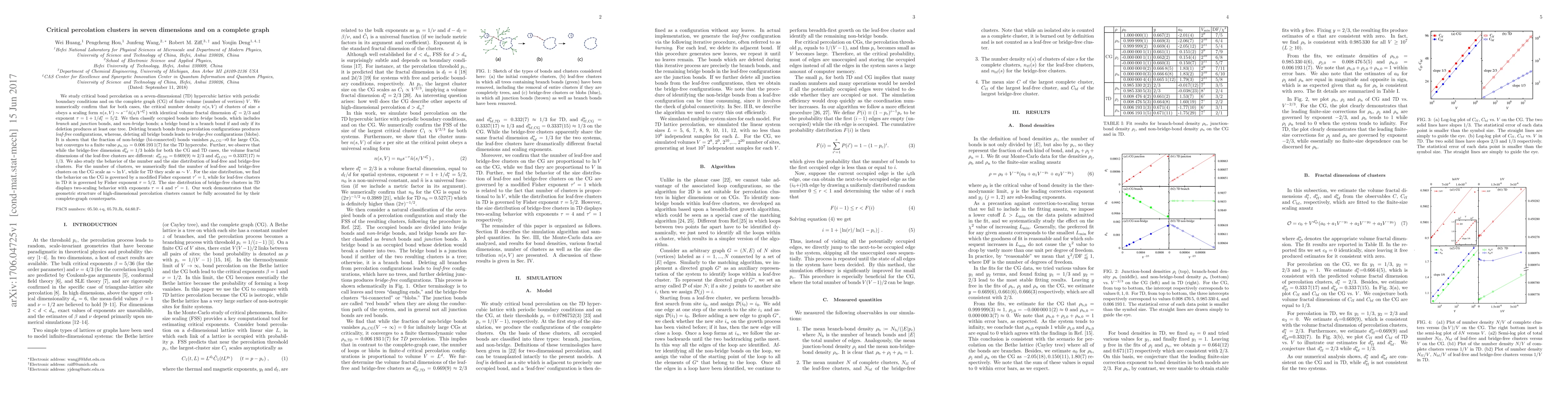 Researchers studied critical percolation clusters in 7 dimensions and on a complete graph, finding that high-dimensional clusters have unique geometric structures not accounted for by their lower-dimensional counterparts.