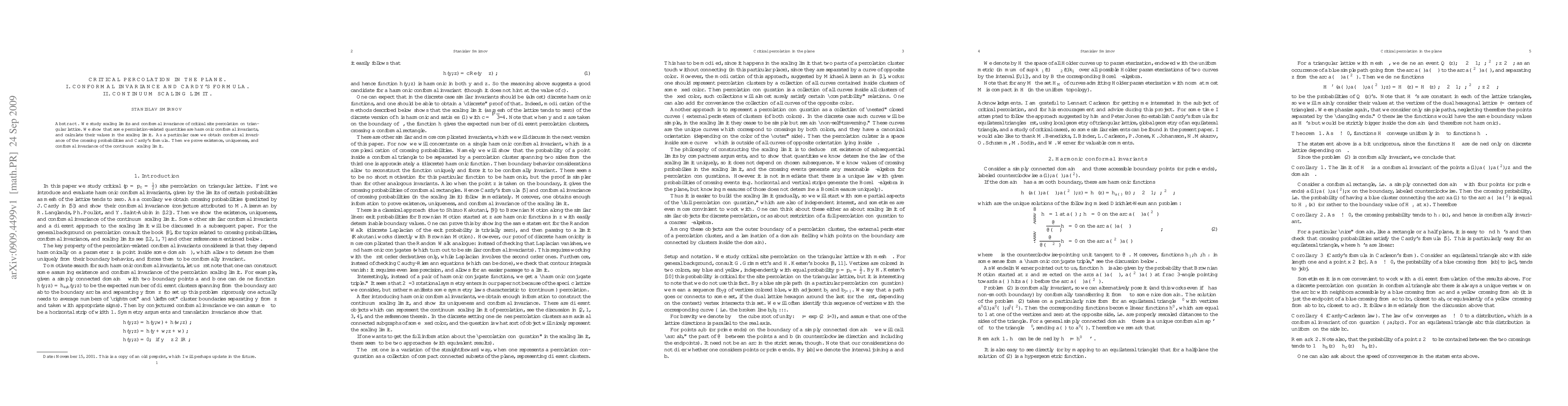 We study scaling limits and conformal invariance of critical site percolation on triangular lattice. We show that some percolation-related quantities are harmonic conformal invariants, and calculate their values in the scaling limit. As a particular case we obtain conformal invariance of the crossing probabilities and Cardy's formula. Then we prove existence, uniqueness, and conformal invariance of the continuum scaling limit.