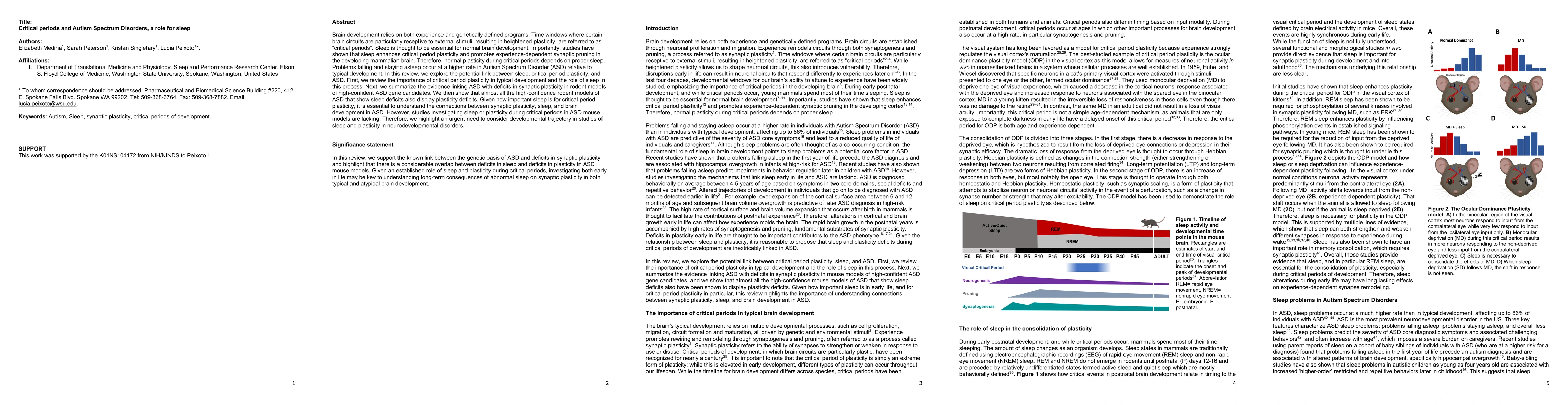 Brain development relies on both experience and genetically defined programs. Time windows where certain brain circuits are particularly receptive to external stimuli, resulting in heightened plasticity, are referred to as critical periods. Sleep is thought to be essential for normal brain development. Importantly, studies have shown that sleep enhances critical period plasticity and promotes experience-dependent synaptic pruning in the developing mammalian brain. Therefore, normal plasticity during critical periods depends on proper sleep. Problems falling and staying asleep occur at a higher rate in Autism Spectrum Disorder (ASD) relative to typical development. In this review, we explore the potential link between sleep, critical period plasticity, and ASD. First, we review the importance of critical period plasticity in typical development and the role of sleep in this process. Next, we summarize the evidence linking ASD with deficits in synaptic plasticity in rodent models of high-confident ASD gene candidates. We then show that almost all the high-confidence rodent models of ASD that show sleep deficits also display plasticity deficits. Given how important sleep is for critical period plasticity, it is essential to understand the connections between synaptic plasticity, sleep, and brain development in ASD. However, studies investigating sleep or plasticity during critical periods in ASD mouse models are lacking. Therefore, we highlight an urgent need to consider developmental trajectory in studies of sleep and plasticity in neurodevelopmental disorders.