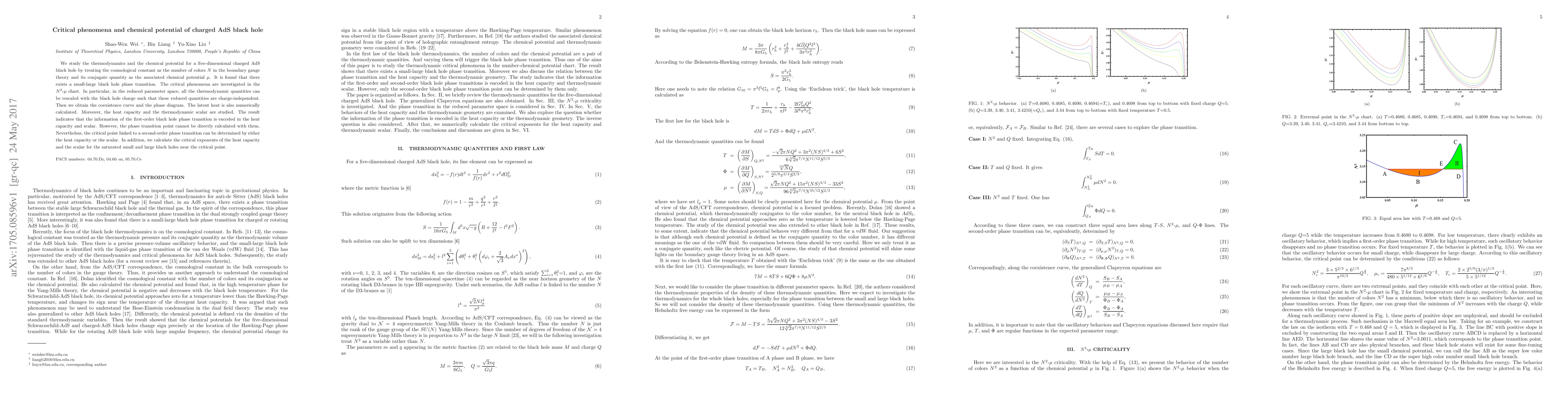 We study the thermodynamics and the chemical potential for a five-dimensional charged AdS black hole by treating the cosmological constant as the number of colors $N$ in the boundary gauge theory and its conjugate quantity as the associated chemical potential $\mu$. It is found that there exists a small-large black hole phase transition. The critical phenomena are investigated in the $N^{2}$-$\mu$ chart. In particular, in the reduced parameter space, all the thermodynamic quantities can be rescaled with the black hole charge such that these reduced quantities are charge-independent. Then we obtain the coexistence curve and the phase diagram. The latent heat is also numerically calculated. Moreover, the heat capacity and the thermodynamic scalar are studied. The result indicates that the information of the first-order black hole phase transition is encoded in the heat capacity and scalar. However, the phase transition point cannot be directly calculated with them. Nevertheless, the critical point linked to a second-order phase transition can be determined by either the heat capacity or the scalar. In addition, we calculate the critical exponents of the heat capacity and the scalar for the saturated small and large black holes near the critical point.