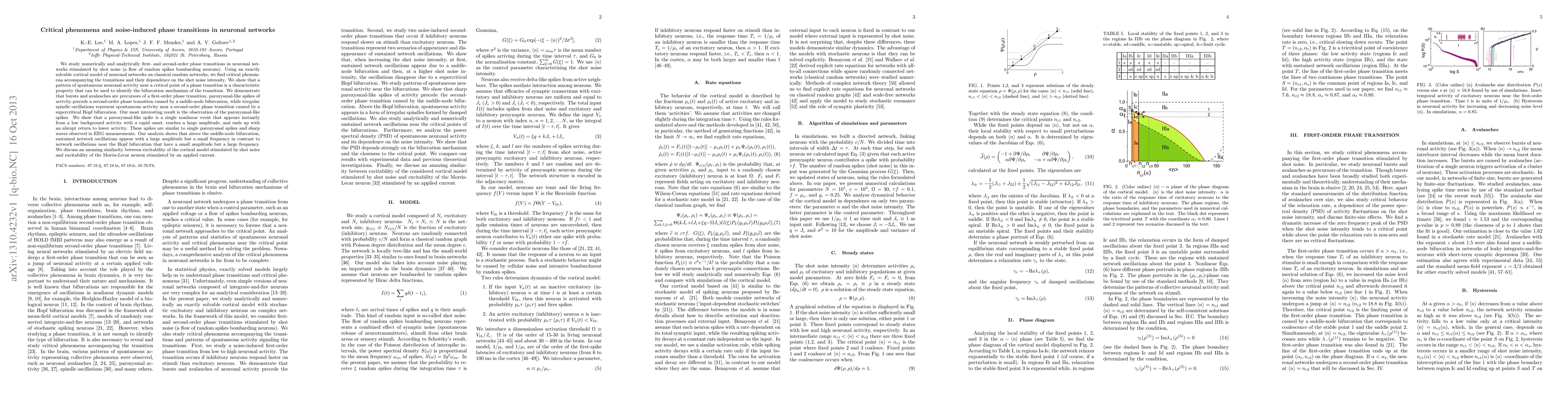 We study numerically and analytically first- and second-order phase transitions in neuronal networks stimulated by shot noise (a flow of random spikes bombarding neurons). Using an exactly solvable cortical model of neuronal networks on classical random networks, we find critical phenomena accompanying the transitions and their dependence on the shot noise intensity. We show that a pattern of spontaneous neuronal activity near a critical point of a phase transition is a characteristic property that can be used to identify the bifurcation mechanism of the transition. We demonstrate that bursts and avalanches are precursors of a first-order phase transition, paroxysmal-like spikes of activity precede a second-order phase transition caused by a saddle-node bifurcation, while irregular spindle oscillations represent spontaneous activity near a second-order phase transition caused by a supercritical Hopf bifurcation. Our most interesting result is the observation of the paroxysmal-like spikes. We show that a paroxysmal-like spike is a single nonlinear event that appears instantly from a low background activity with a rapid onset, reaches a large amplitude, and ends up with an abrupt return to lower activity. These spikes are similar to single paroxysmal spikes and sharp waves observed in EEG measurements. Our analysis shows that above the saddle-node bifurcation, sustained network oscillations appear with a large amplitude but a small frequency in contrast to network oscillations near the Hopf bifurcation that have a small amplitude but a large frequency. We discuss an amazing similarity between excitability of the cortical model stimulated by shot noise and excitability of the Morris-Lecar neuron stimulated by an applied current.