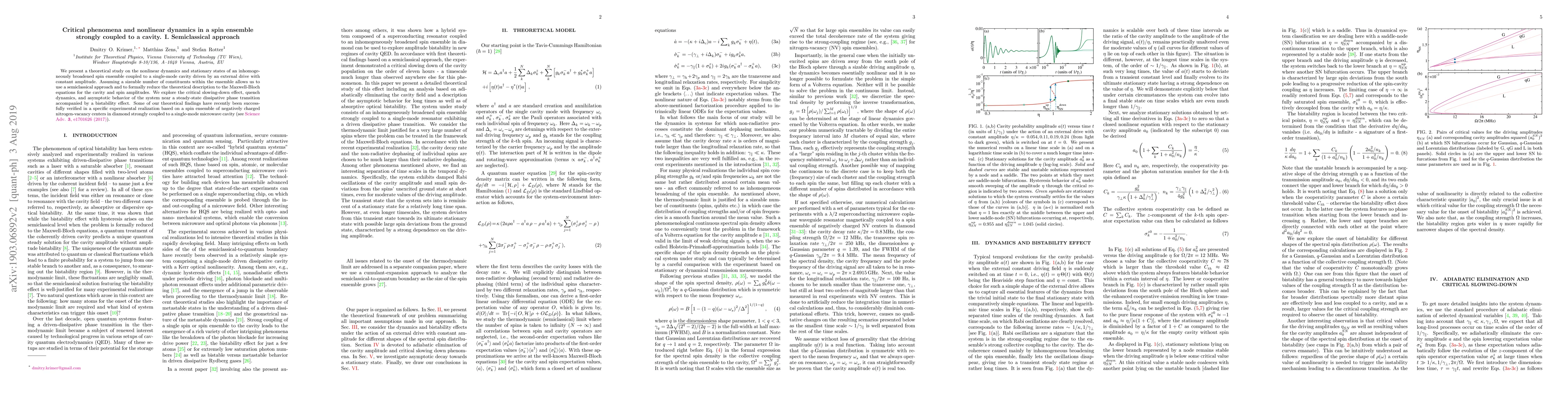 This paper investigates the nonlinear dynamics and stationary states of a spin ensemble strongly coupled to a cavity using a semiclassical approach, focusing on critical phenomena and the Maxwell-Bloch equations. It explores critical slowing-down, quench dynamics, and bistability near a dissipative phase transition, with experimental validation using nitrogen-vacancy centers in diamond.