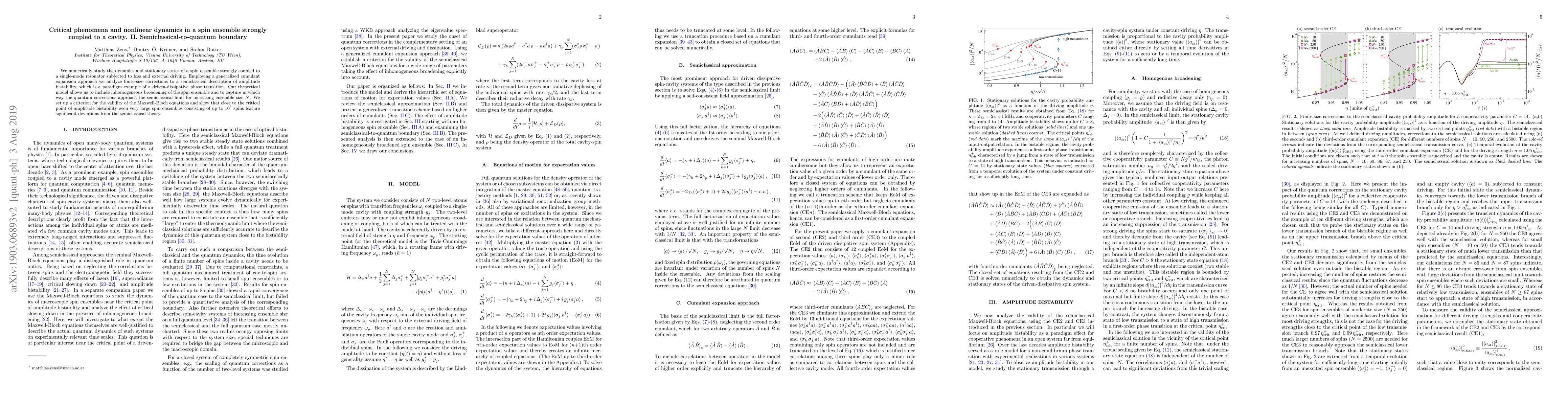 This paper numerically investigates the dynamics and stationary states of a spin ensemble strongly coupled to a cavity, focusing on amplitude bistability and driven-dissipative phase transitions. It employs a generalized cumulant expansion to analyze finite-size corrections and demonstrates significant deviations from semiclassical theory even in large spin ensembles near the critical point.