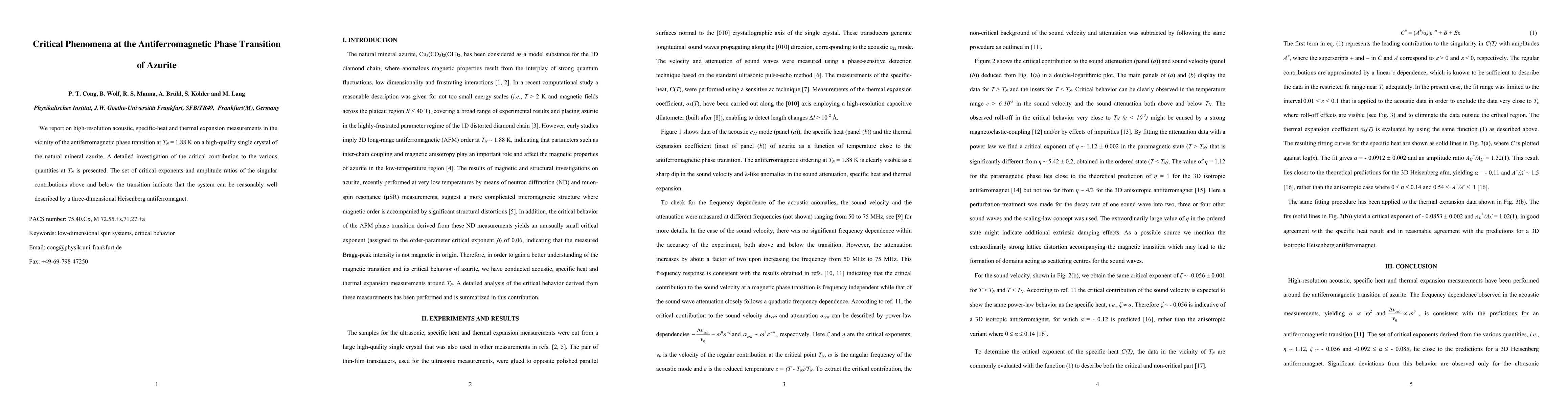 This paper investigates the critical phenomena during the antiferromagnetic phase transition in azurite at 1.88 K using acoustic, specific-heat, and thermal expansion measurements. The results suggest the system behaves like a three-dimensional Heisenberg antiferromagnet, with detailed critical exponents and amplitude ratios analyzed.