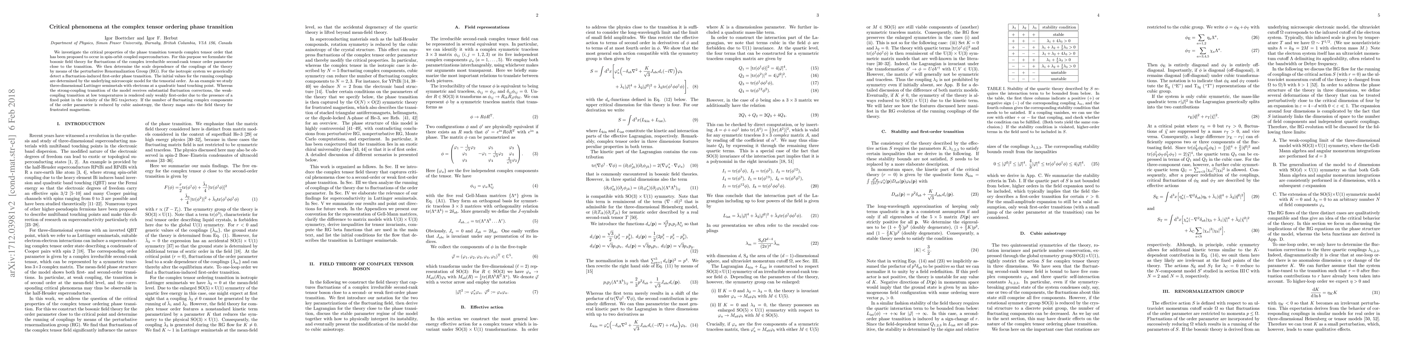 We investigate the critical properties of the phase transition towards complex tensor order that has been proposed to occur in spin-orbit coupled superconductors. For this purpose we formulate the bosonic field theory for fluctuations of the complex irreducible second-rank tensor order parameter close to the transition. We then determine the scale dependence of the couplings of the theory by means of the perturbative Renormalization Group (RG). For the isotropic system we generically detect a fluctuation-induced first-order phase transition. The initial values for the running couplings are determined by the underlying microscopic model for the tensorial order. As an example we study three-dimensional Luttinger semimetals with electrons at a quadratic band touching point. Whereas the strong-coupling transition of the model receives substantial fluctuation corrections, the weak-coupling transition at low temperatures is rendered only weakly first-order due to the presence of a fixed point in the vicinity of the RG trajectory. If the number of fluctuating complex components of the order parameter is reduced by cubic anisotropy, the theory maps onto the field theory for frustrated magnetism.