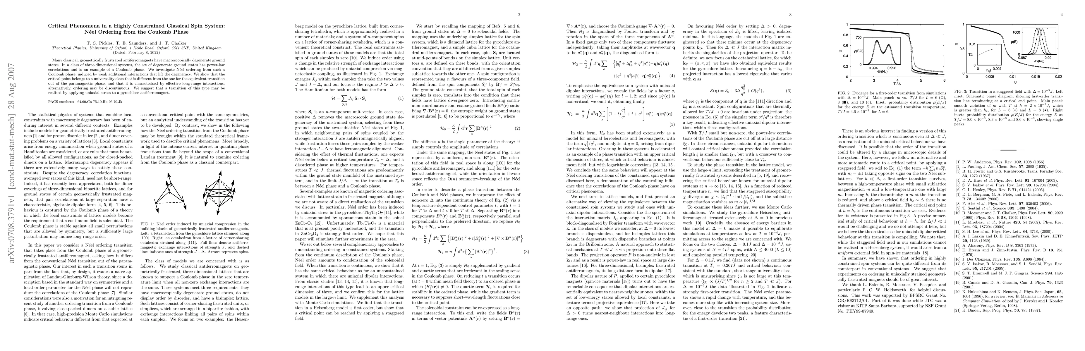 Many classical, geometrically frustrated antiferromagnets have macroscopically degenerate ground states. In a class of three-dimensional systems, the set of degenerate ground states has power-law correlations and is an example of a Coulomb phase. We investigate Neel ordering from such a Coulomb phase, induced by weak additional interactions that lift the degeneracy. We show that the critical point belongs to a universality class that is different from the one for the equivalent transition out of the paramagnetic phase, and that it is characterised by effective long-range interactions; alternatively, ordering may be discontinuous. We suggest that a transition of this type may be realised by applying uniaxial stress to a pyrochlore antiferromagnet.
