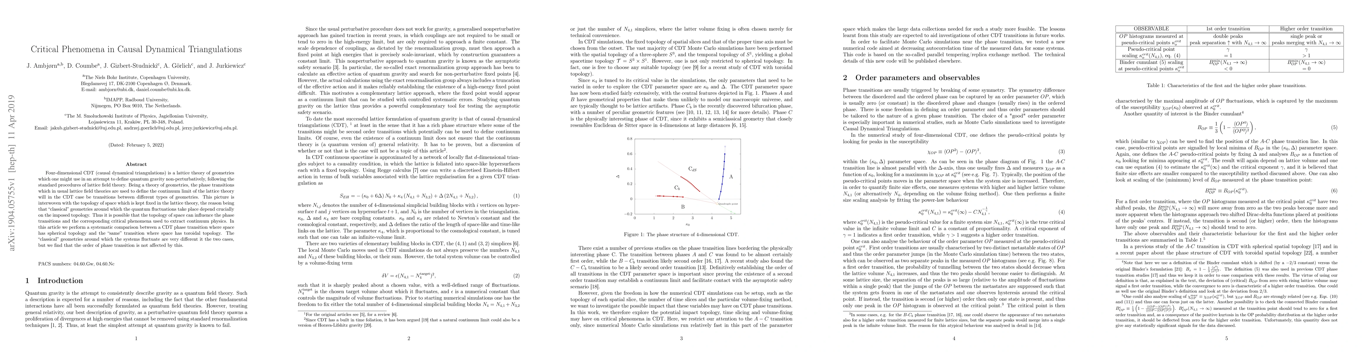 This paper investigates phase transitions in four-dimensional causal dynamical triangulations (CDT), a non-perturbative approach to quantum gravity, and finds that while the topology of space influences the "classical" geometries around which quantum fluctuations occur, it does not affect the order of the phase transition.