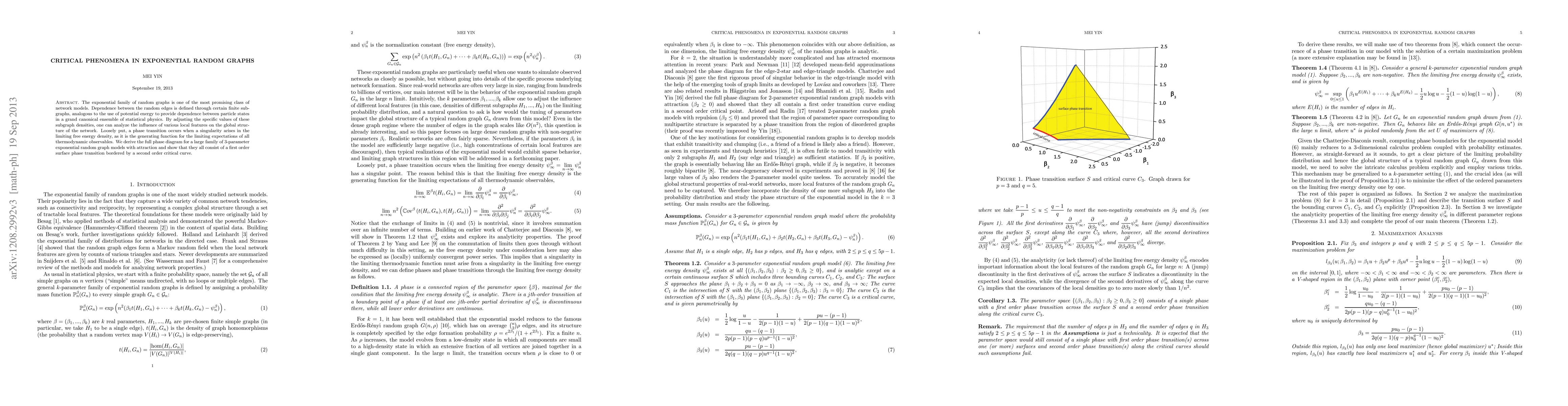 The exponential family of random graphs is one of the most promising class of network models. Dependence between the random edges is defined through certain finite subgraphs, analogous to the use of potential energy to provide dependence between particle states in a grand canonical ensemble of statistical physics. By adjusting the specific values of these subgraph densities, one can analyze the influence of various local features on the global structure of the network. Loosely put, a phase transition occurs when a singularity arises in the limiting free energy density, as it is the generating function for the limiting expectations of all thermodynamic observables. We derive the full phase diagram for a large family of 3-parameter exponential random graph models with attraction and show that they all consist of a first order surface phase transition bordered by a second order critical curve.