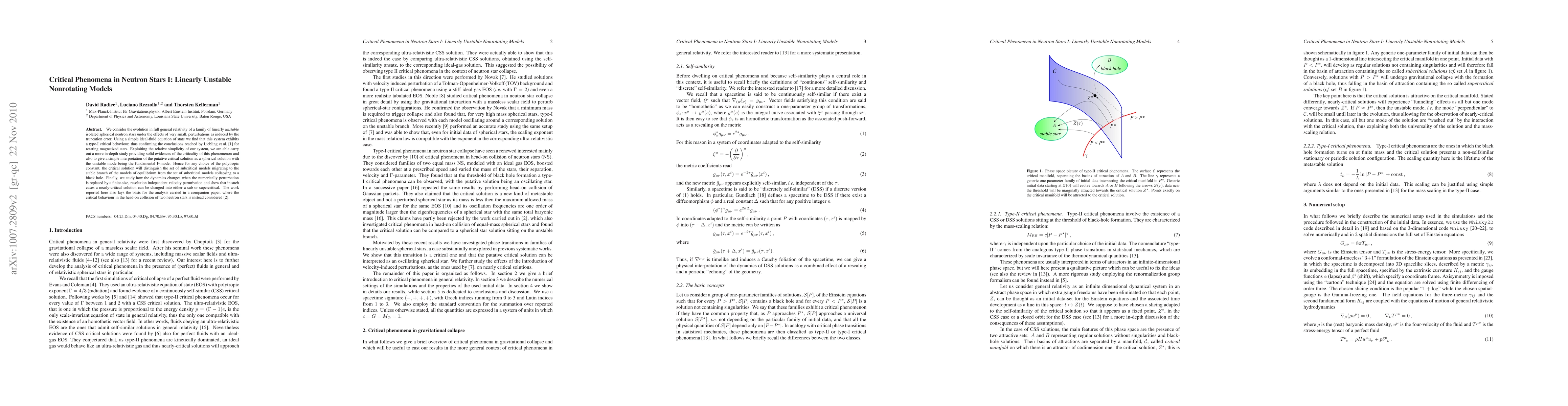This paper investigates the critical phenomena in linearly unstable, nonrotating neutron stars under small perturbations, confirming type-I critical behavior in full general relativity. It provides a detailed study of the critical solution, interpreting it as a fundamental F-mode, and explores the dynamics of nearly-critical solutions under different perturbations.