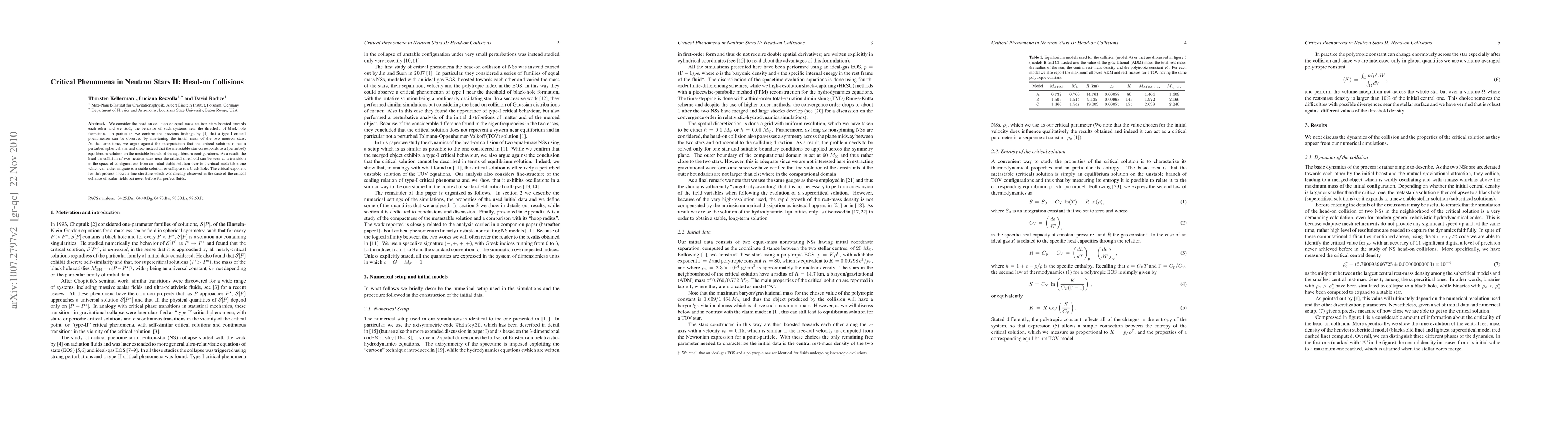 This paper investigates the head-on collision of equal-mass neutron stars near the black-hole formation threshold, confirming a type-I critical phenomenon. It argues against the notion that the critical solution is non-spherical, instead showing it as a perturbed equilibrium on the unstable branch, leading to a transition from stable to metastable configurations that may evolve into a stable solution or collapse.