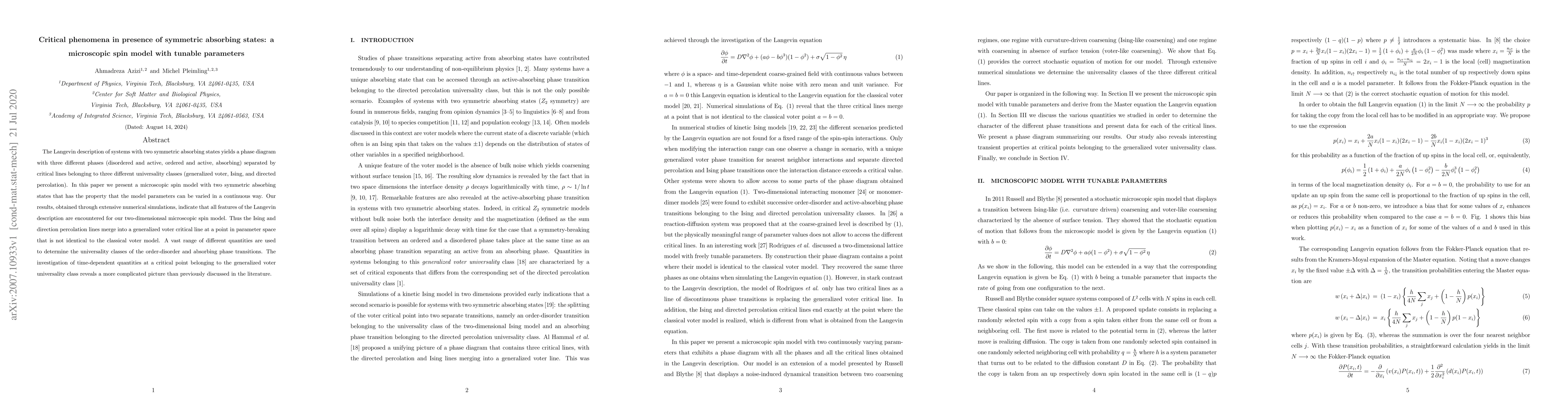 This paper presents a microscopic spin model with tunable parameters to study critical phenomena in systems with symmetric absorbing states. Numerical simulations reveal that the model exhibits three phases and critical lines belonging to different universality classes, merging into a generalized voter critical line under certain conditions.