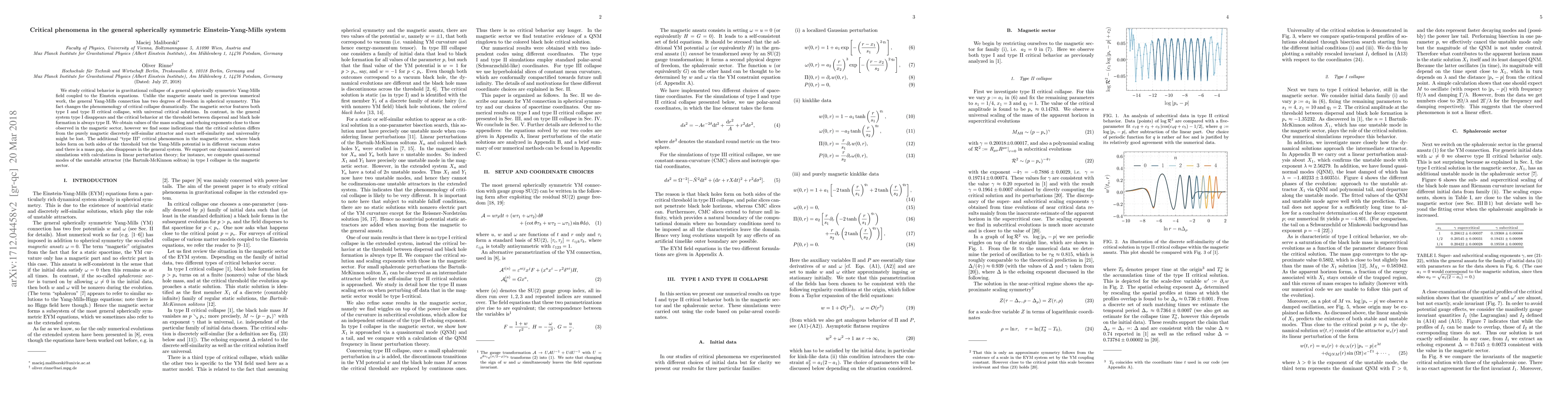 The paper presents detailed numerical simulations and analytical calculations in linear perturbation theory, comparing the critical behavior in the magnetic and sphaleronic sectors of the Einstein-Yang-Mills system.