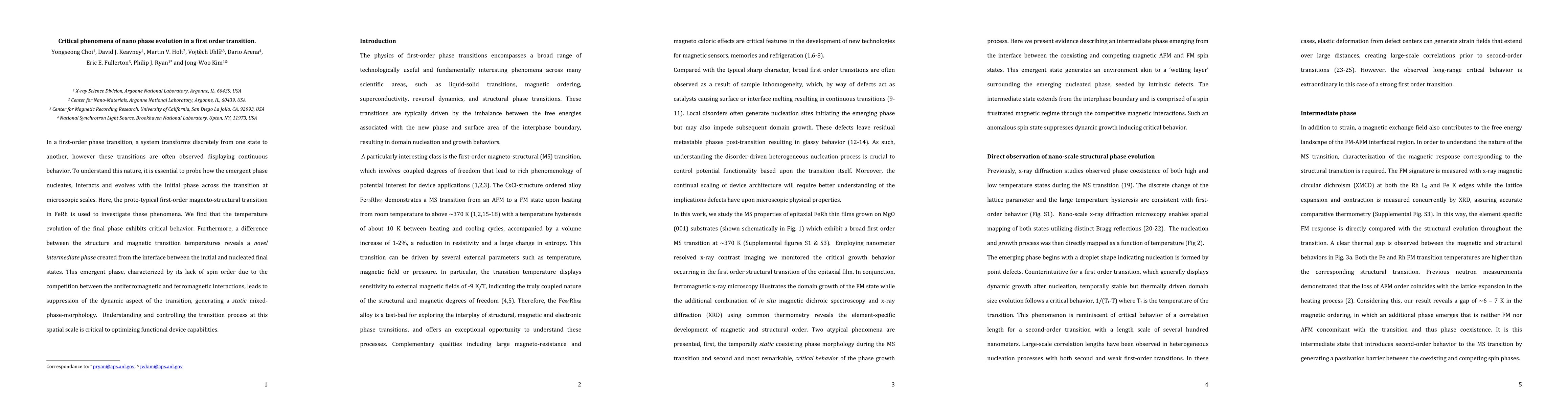 First order phase transitions occur discretely from one state to another, however they often display continuous behavior. To understand this nature, it is essential to probe how the emergent phase nucleates, interacts and evolves with the initial phase across the transition at microscopic scales. Here, the prototypical first-order magneto-structural transition in FeRh is used to investigate these phenomena. We find that the temperature evolution of the final phase exhibits critical behavior. Furthermore, a difference between the structure and magnetic transition temperatures reveals a novel intermediate phase created from the interface between the initial and nucleated final states. This emergent phase, characterized by its lack of spin order due to the competition between the antiferromagnetic and ferromagnetic interactions, leads to suppression of the dynamic aspect of the transition, generating a static mixed-phase-morphology. Understanding and controlling the transition process at this spatial scale is critical to optimizing functional device capabilities.
