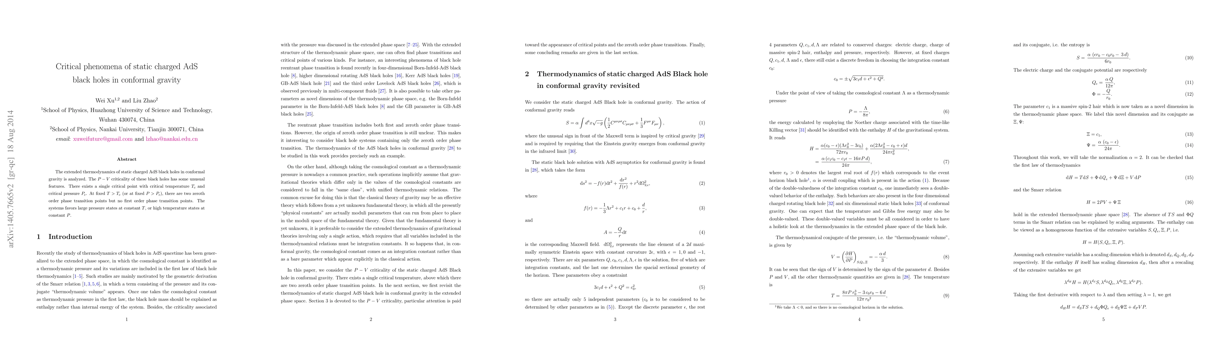 This paper investigates the thermodynamic properties of static charged AdS black holes in conformal gravity, revealing a unique $P-V$ criticality with a single critical point characterized by $T_c$ and $P_c$. It shows that above the critical temperature or pressure, there are two zeroth-order phase transition points without first-order transitions, favoring large pressure or high temperature states.