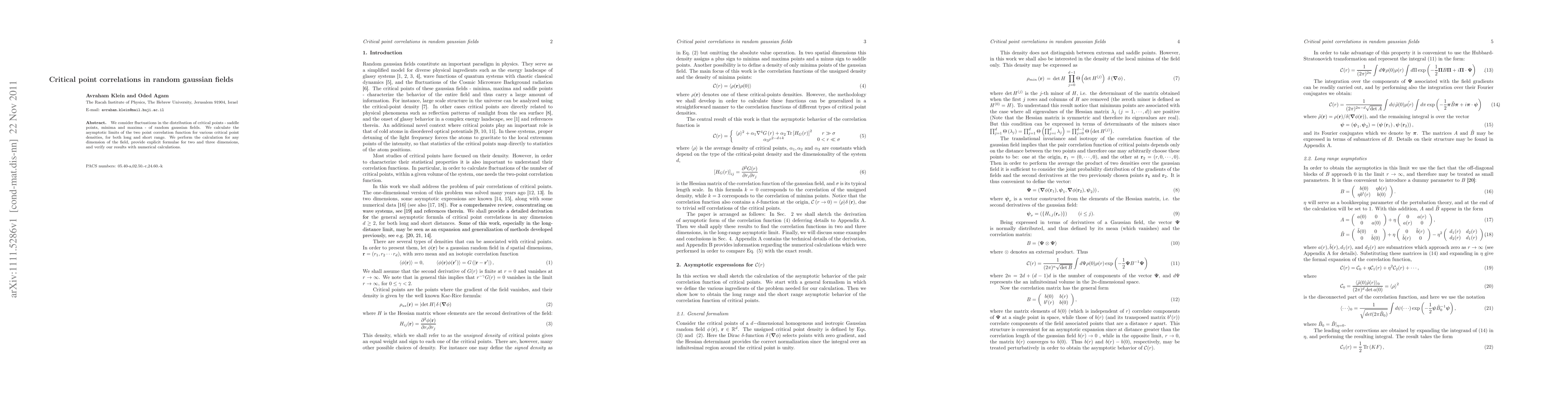 This paper studies how critical points in random gaussian fields correlate with each other, finding asymptotic limits for various densities and dimensions.
