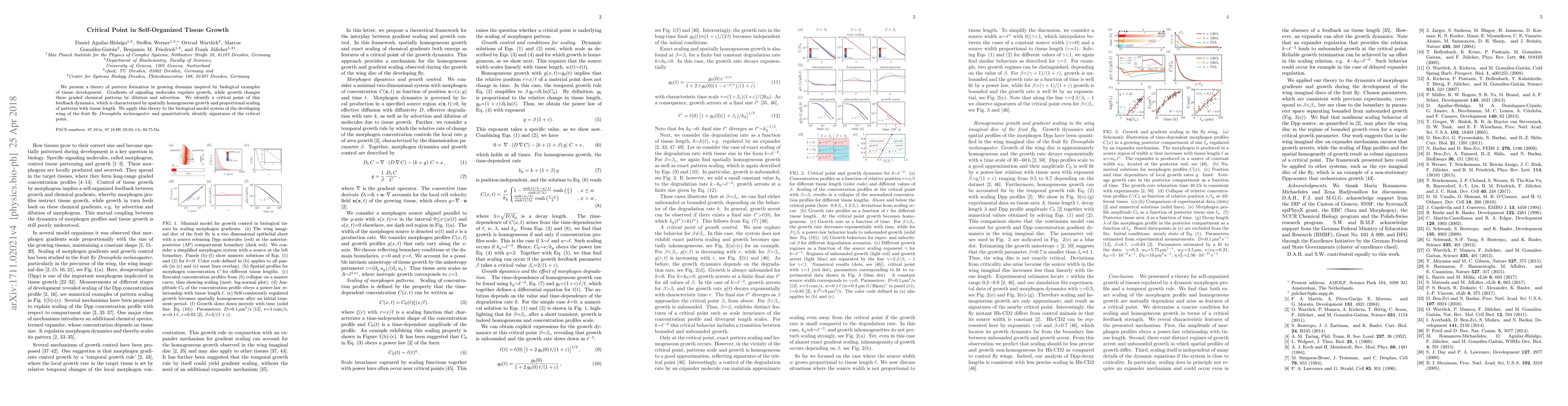This research identifies a critical point in the growth of biological tissues, like a fly's wing, where growth is uniform and patterns scale proportionally with tissue size. The study uses a theoretical model of signaling molecules and growth dynamics to explain this phenomenon.