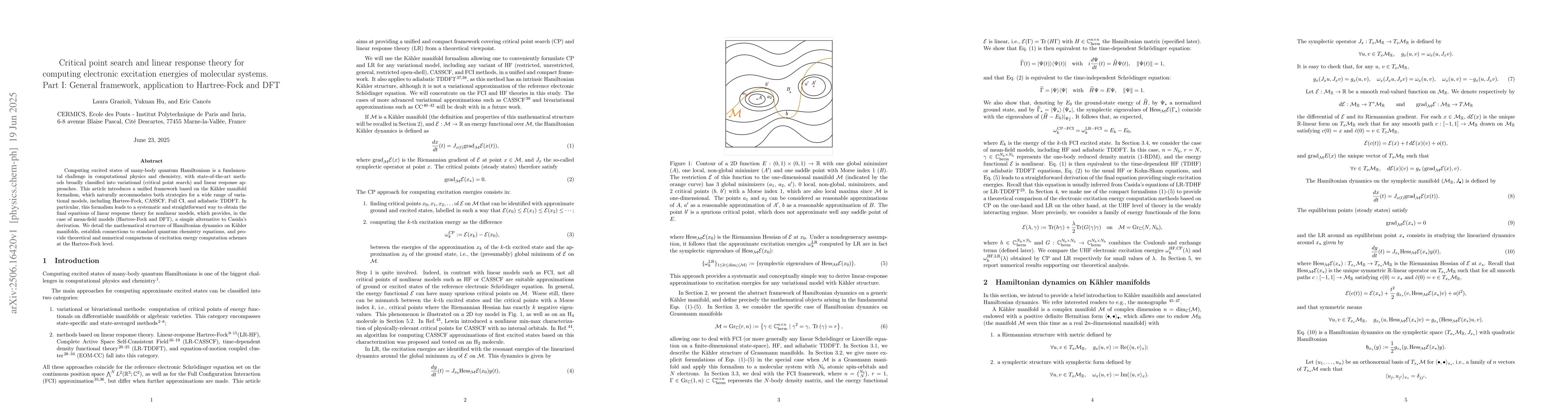 Computing excited states of many-body quantum Hamiltonians is a fundamental challenge in computational physics and chemistry, with state-of-the-art methods broadly classified into variational (critical point search) and linear response approaches. This article introduces a unified framework based on the K\"ahler manifold formalism, which naturally accommodates both strategies for a wide range of variational models, including Hartree-Fock, CASSCF, Full CI, and adiabatic TDDFT. In particular, this formalism leads to a systematic and straightforward way to obtain the final equations of linear response theory for nonlinear models, which provides, in the case of mean-field models (Hartree-Fock and DFT), a simple alternative to Casida's derivation. We detail the mathematical structure of Hamiltonian dynamics on K\"ahler manifolds, establish connections to standard quantum chemistry equations, and provide theoretical and numerical comparisons of excitation energy computation schemes at the Hartree-Fock level.