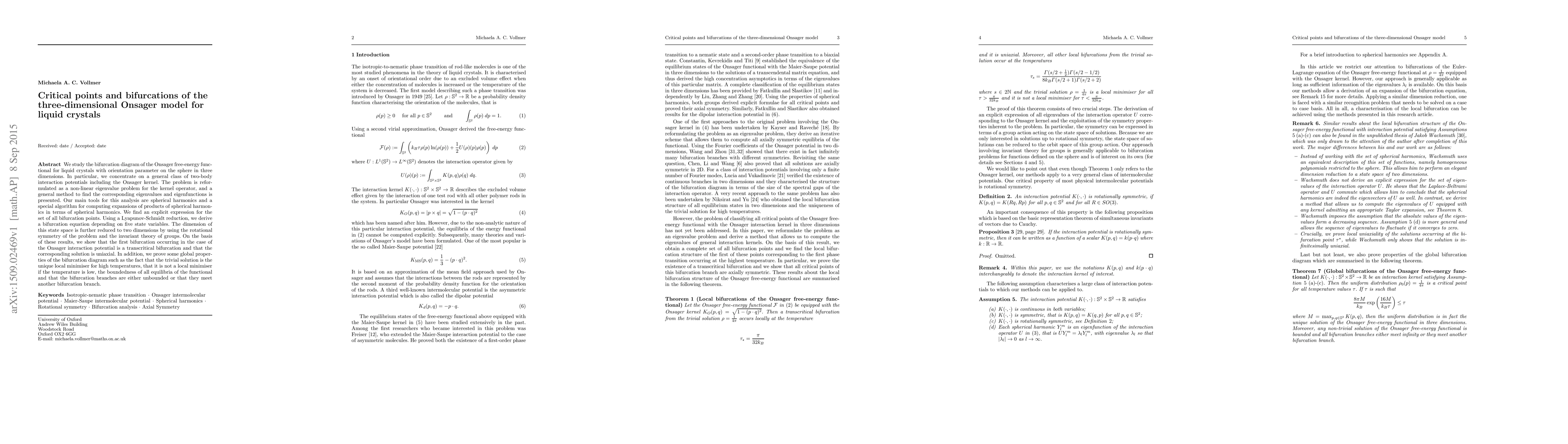 We study the bifurcation diagram of the Onsager free-energy func- tional for liquid crystals with orientation parameter on the sphere in three dimensions. In particular, we concentrate on a very general class of two- body interaction potentials including the Onsager kernel. The problem is reformulated as a non-linear eigenvalue problem for the kernel operator, and a general method to find the corresponding eigenvalues and eigenfunctions is presented. Our main tools for this analysis are spherical harmonics and a special algorithm for computing expansions of products of spherical harmon- ics in terms of spherical harmonics. We find an explicit expression for the set of all bifurcation points. Using a Lyapunov-Schmidt reduction, we derive a bifurcation equation depending on five state variables. The dimension of this state space is further reduced to two dimensions by using the rotational symmetry of the problem and the theory of invariant polynomials. On the basis of these result, we show that the first bifurcation occurring in case of the Onsager interaction potential is a transcritical bifurcation and that the corresponding solution is uniaxial. In addition, we prove some global proper- ties of the bifurcation diagram such as the fact that the trivial solution is the unique local minimiser for high temperatures, that it is not a local minimiser if the temperature is low, the boundedness of all equilibria of the functional and that the bifurcation branches are either unbounded or that they meet another bifurcation branch.