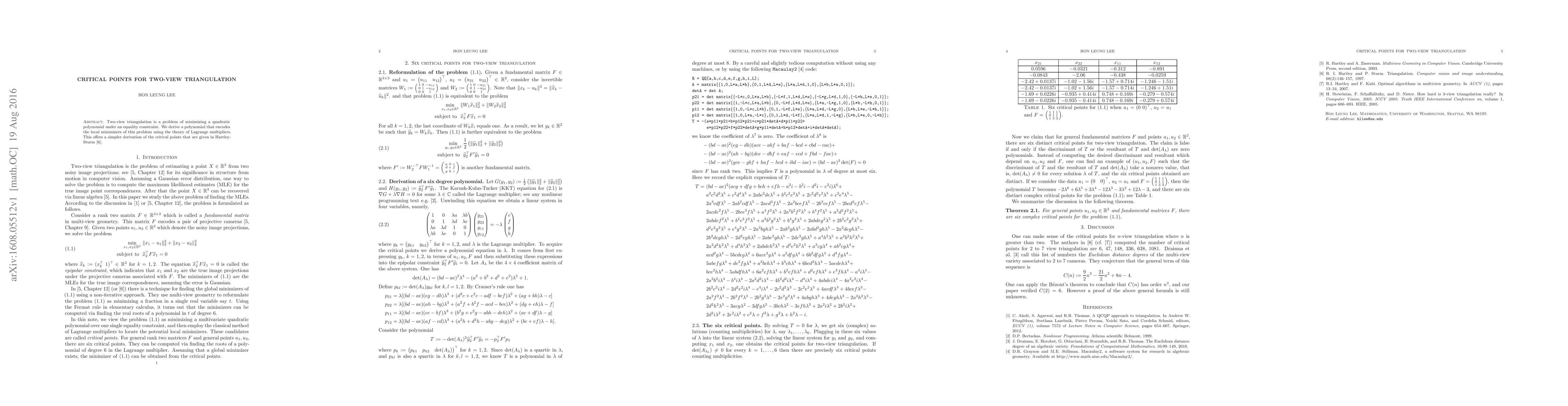 Two-view triangulation is a problem of minimizing a quadratic polynomial under an equality constraint. We derive a polynomial that encodes the local minimizers of this problem using the theory of Lagrange multipliers. This offers a simpler derivation of the critical points that are given in Hartley-Sturm [6].