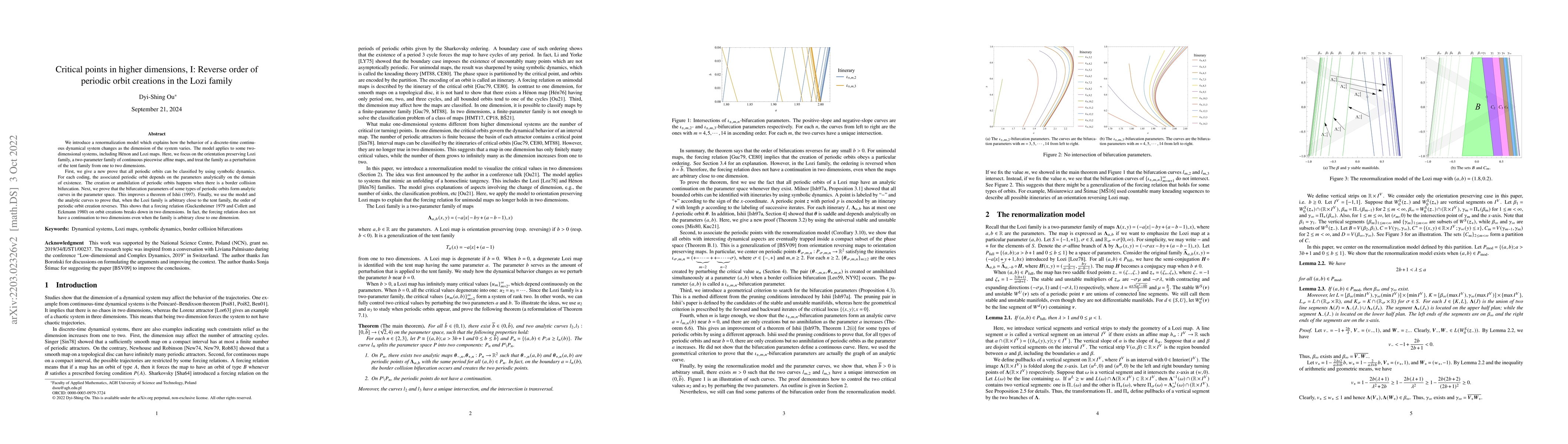This paper introduces a renormalization model to explain changes in a discrete-time dynamical system's behavior across varying dimensions, focusing on the Lozi family of maps. It proves that periodic orbits in the Lozi family can be classified using symbolic dynamics and that bifurcation parameters form analytic curves, reversing the usual order of periodic orbit creation when close to the tent family.