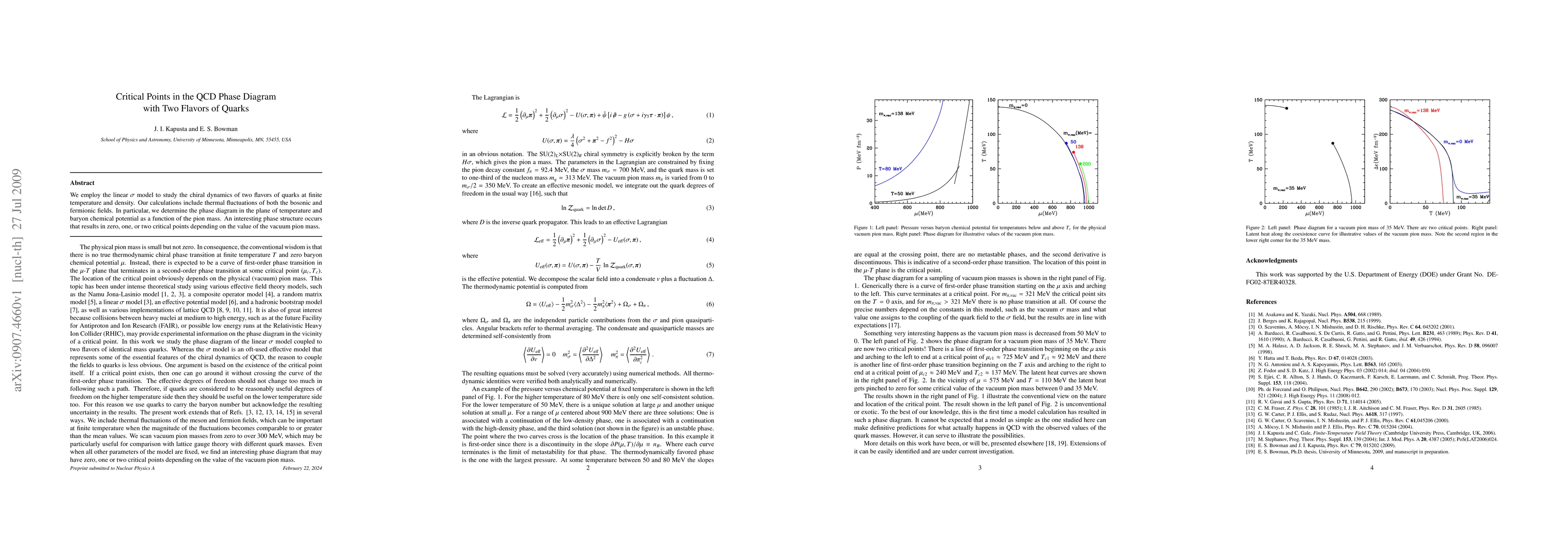 We employ the linear sigma model to study the chiral dynamics of two flavors of quarks at finite temperature and density. Our calculations include thermal fluctuations of both the bosonic and fermionic fields. In particular, we determine the phase diagram in the plane of temperature and baryon chemical potential as a function of the pion mass. An interesting phase structure occurs that results in zero, one, or two critical points depending on the value of the vacuum pion mass.