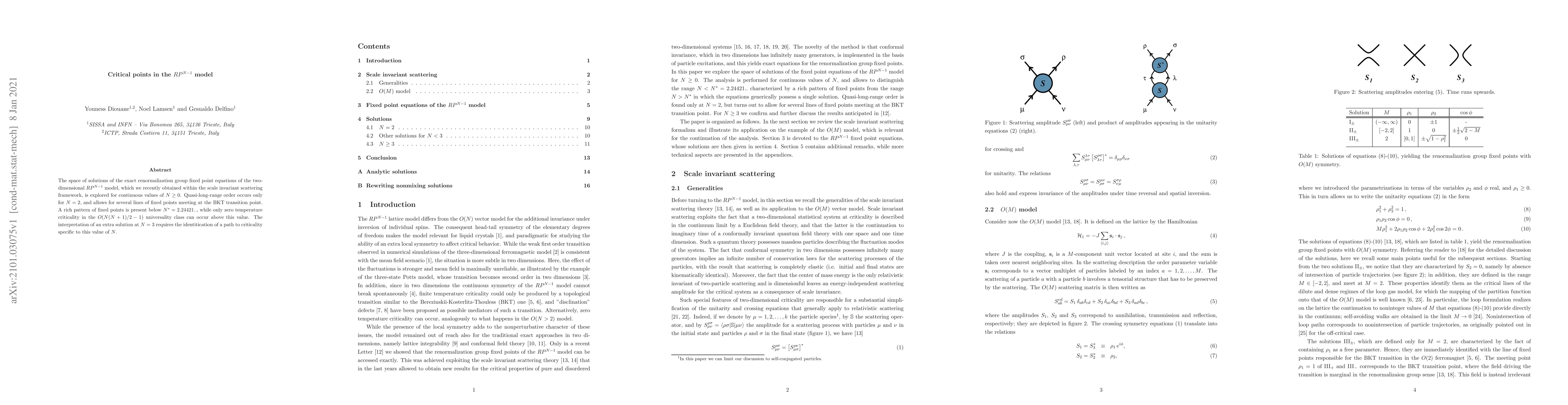 The space of solutions of the exact renormalization group fixed point equations of the two-dimensional $RP^{N-1}$ model, which we recently obtained within the scale invariant scattering framework, is explored for continuous values of $N\geq 0$. Quasi-long-range order occurs only for $N=2$, and allows for several lines of fixed points meeting at the BKT transition point. A rich pattern of fixed points is present below $N^*=2.24421..$, while only zero temperature criticality in the $O(N(N+1)/2-1)$ universality class can occur above this value. The interpretation of an extra solution at $N=3$ requires the identitication of a path to criticality specific to this value of $N$.