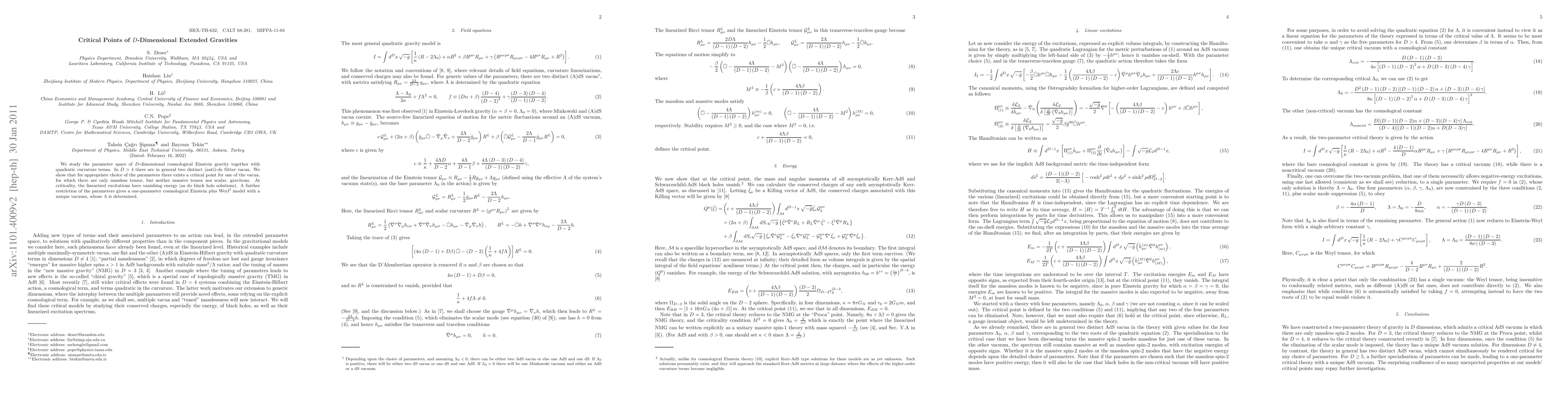 We study the parameter space of D-dimensional cosmological Einstein gravity together with quadratic curvature terms. In D>4 there are in general two distinct (anti)-de Sitter vacua. We show that for appropriate choice of the parameters there exists a critical point for one of the vacua, for which there are only massless tensor, but neither massive tensor nor scalar, gravitons. At criticality, the linearized excitations have vanishing energy (as do black hole solutions). A further restriction of the parameters gives a one-parameter cosmological Einstein plus Weyl^2 model with a unique vacuum, whose \Lambda is determined.