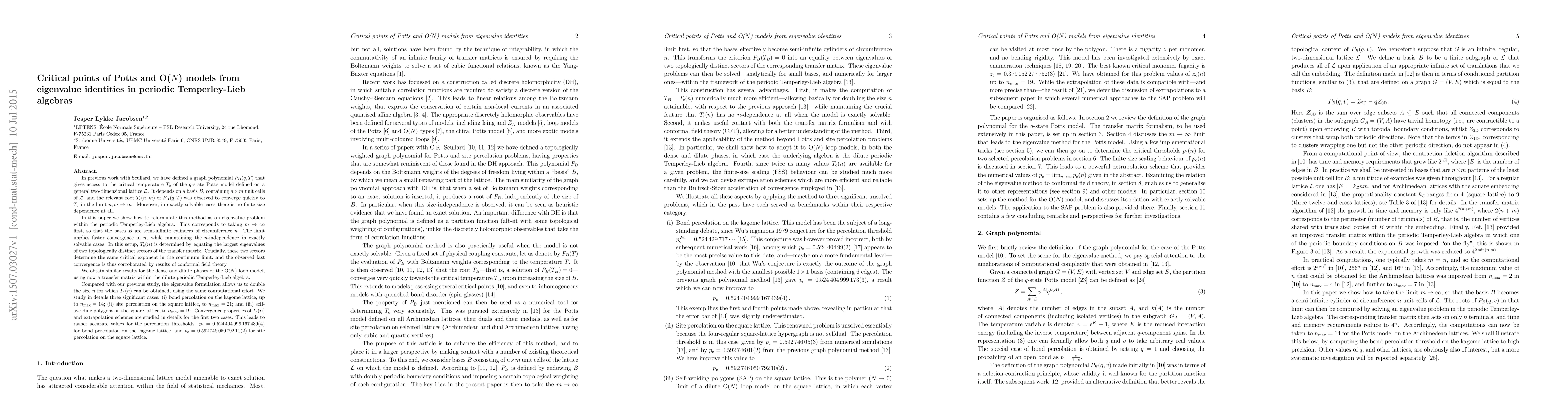 This paper reformulates the method for determining critical temperatures of Potts and O($N$) models as an eigenvalue problem within periodic Temperley-Lieb algebras, achieving faster convergence and accurate percolation thresholds for various lattice models. The method leverages the largest eigenvalues of two distinct sectors of the transfer matrix, corroborated by conformal field theory.