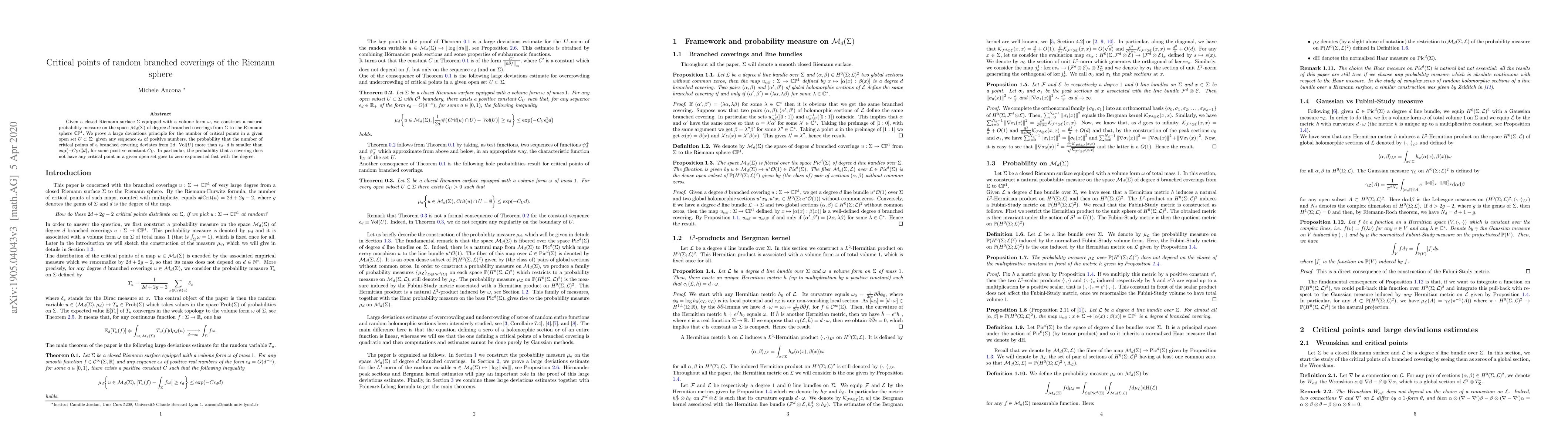 This paper constructs a probability measure on degree $d$ branched coverings of a Riemann surface $\Sigma$ to the Riemann sphere and proves a large deviations principle for the number of critical points in an open set $U$. The probability of significant deviation from the expected number of critical points decays exponentially fast with the degree $d$.
