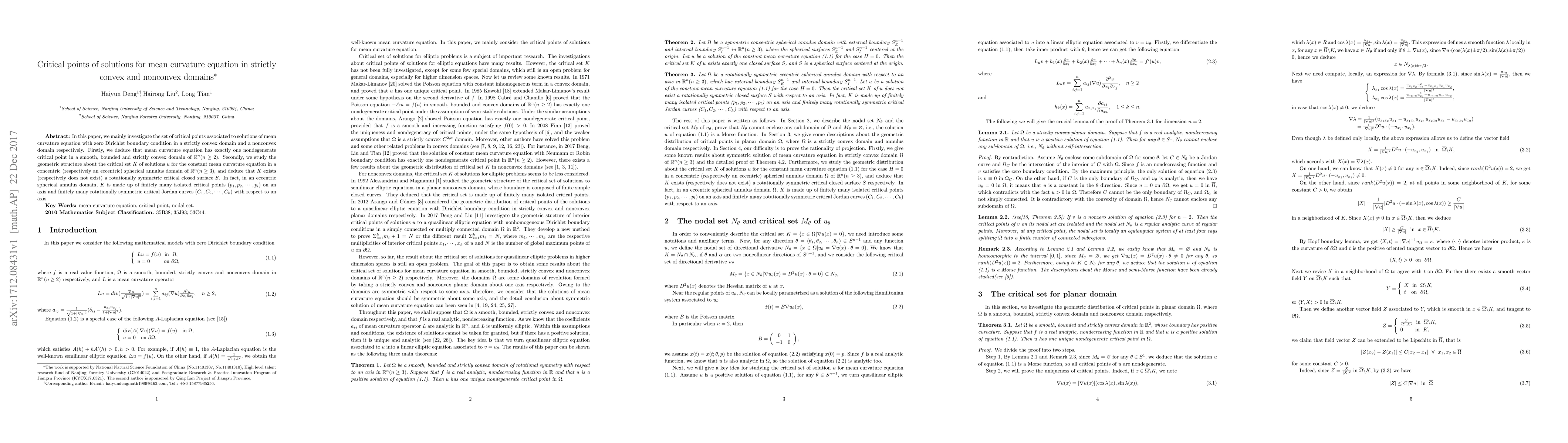 In this paper, we mainly investigate the set of critical points associated to solutions of mean curvature equation with zero Dirichlet boundary condition in a strictly convex domain and a nonconvex domain respectively. Firstly, we deduce that mean curvature equation has exactly one nondegenerate critical point in a smooth, bounded and strictly convex domain of $\mathbb{R}^{n}(n\geq2)$. Secondly, we study the geometric structure about the critical set $K$ of solutions $u$ for the constant mean curvature equation in a concentric (respectively an eccentric) spherical annulus domain of $\mathbb{R}^{n}(n\geq3)$, and deduce that $K$ exists (respectively does not exist) a rotationally symmetric critical closed surface $S$. In fact, in an eccentric spherical annulus domain, $K$ is made up of finitely many isolated critical points ($p_1,p_2,\cdots,p_l$) on an axis and finitely many rotationally symmetric critical Jordan curves ($C_1,C_2,\cdots,C_k$) with respect to an axis.