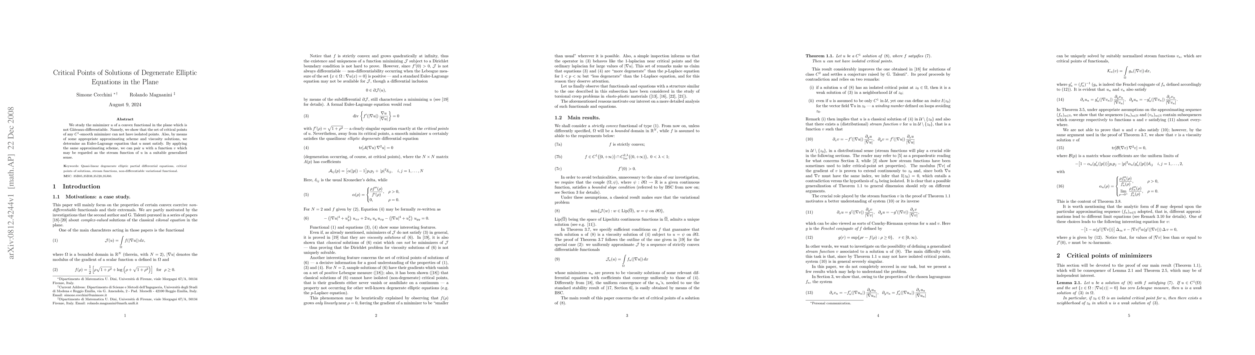 This research paper shows that critical points of solutions to degenerate elliptic equations in the plane cannot have isolated points, and a suitable Euler-Lagrange equation is derived.