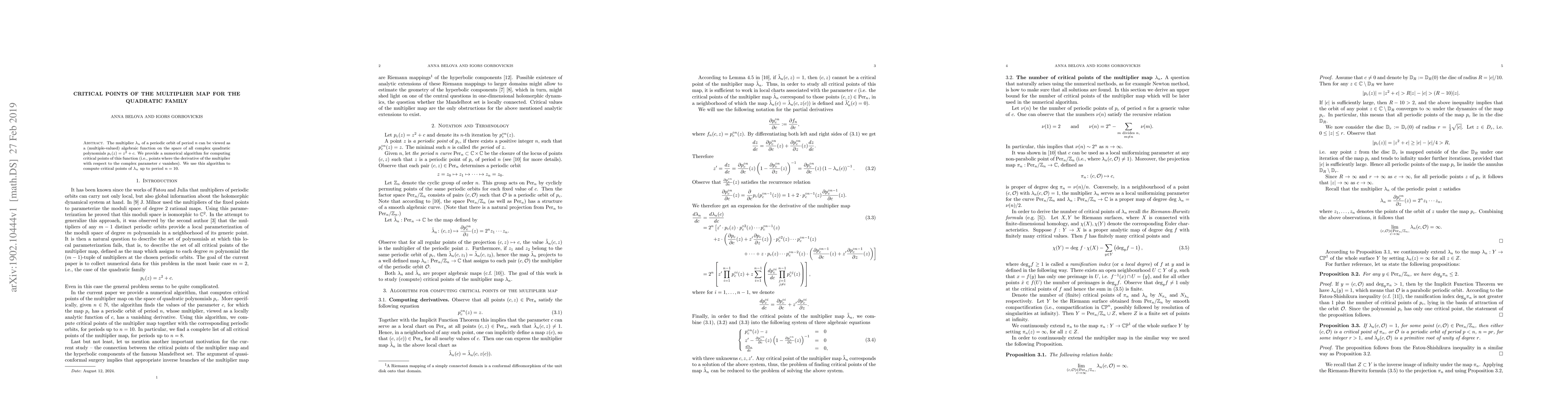 The multiplier $\lambda_n$ of a periodic orbit of period $n$ can be viewed as a (multiple-valued) algebraic function on the space of all complex quadratic polynomials $p_c(z)=z^2+c$. We provide a numerical algorithm for computing critical points of this function (i.e., points where the derivative of the multiplier with respect to the complex parameter $c$ vanishes). We use this algorithm to compute critical points of $\lambda_n$ up to period $n=10$.