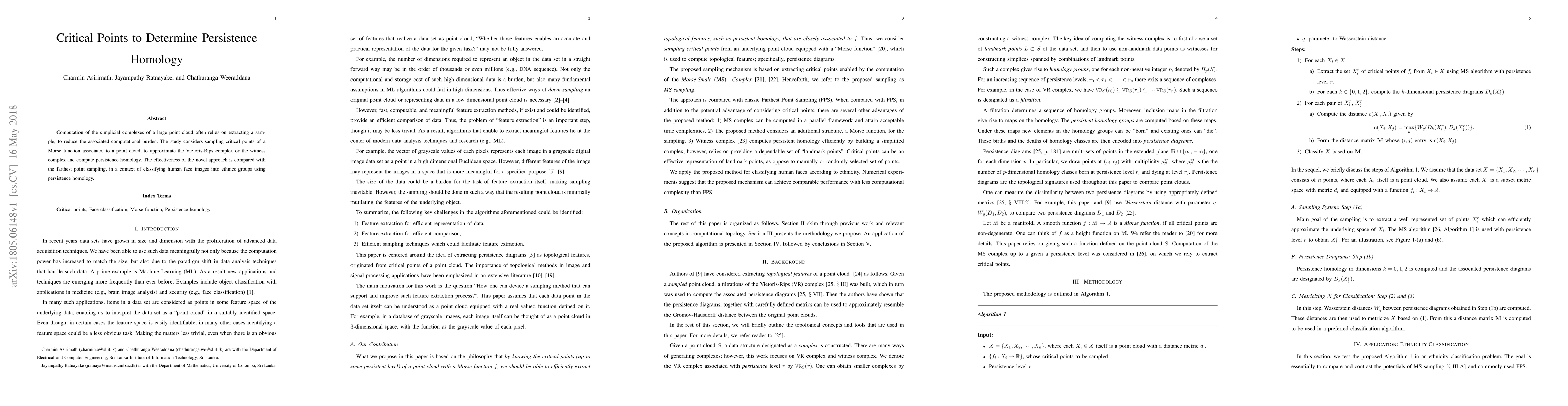 This research proposes using critical points of a Morse function to sample point clouds, approximating complexes like Vietoris-Rips and witness for persistence homology computation. It compares this method with farthest point sampling, demonstrating its effectiveness in classifying human face images into ethnic groups using persistence homology.