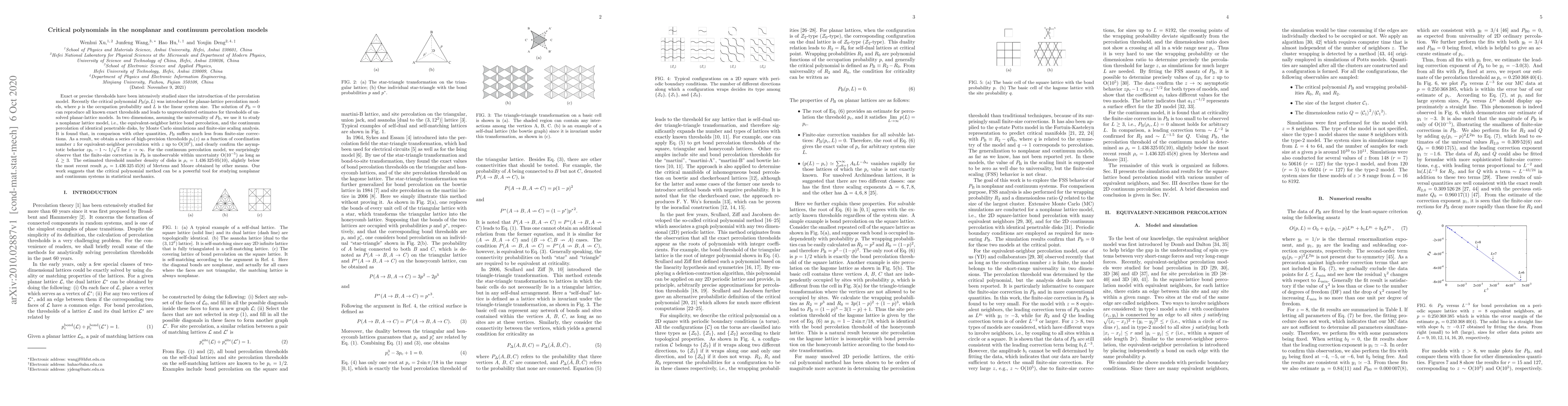 Exact or precise thresholds have been intensively studied since the introduction of the percolation model. Recently the critical polynomial $P_{\rm B}(p,L)$ was introduced for planar-lattice percolation models, where $p$ is the occupation probability and $L$ is the linear system size. The solution of $P_{\rm B} = 0$ can reproduce all known exact thresholds and leads to unprecedented estimates for thresholds of unsolved planar-lattice models. In two dimensions, assuming the universality of $P_{\rm B}$, we use it to study a nonplanar lattice model, i.e., the equivalent-neighbor lattice bond percolation, and the continuum percolation of identical penetrable disks, by Monte Carlo simulations and finite-size scaling analysis. It is found that, in comparison with other quantities, $P_{\rm B}$ suffers much less from finite-size corrections. As a result, we obtain a series of high-precision thresholds $p_c(z)$ as a function of coordination number $z$ for equivalent-neighbor percolation with $z$ up to O$(10^5)$, and clearly confirm the asymptotic behavior $zp_c-1 \sim 1/\sqrt{z}$ for $z \rightarrow \infty$. For the continuum percolation model, we surprisingly observe that the finite-size correction in $P_{\rm B}$ is unobservable within uncertainty O$(10^{-5})$ as long as $L \geq 3$. The estimated threshold number density of disks is $\rho_c = 1.436 325 05(10)$, slightly below the most recent result $\rho_c = 1.436 325 45(8)$ of Mertens and Moore obtained by other means. Our work suggests that the critical polynomial method can be a powerful tool for studying nonplanar and continuum systems in statistical mechanics.