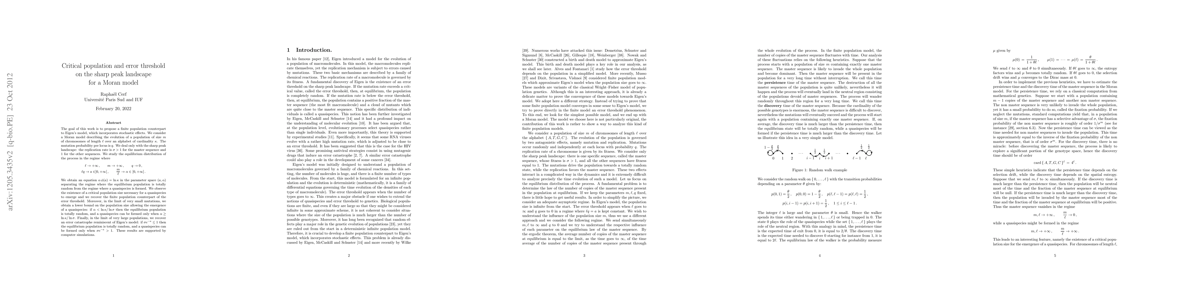 This paper proposes a finite population version of Eigen's model, analyzing a Moran model with stochastic effects to determine the critical population size and error threshold for the emergence of a quasispecies on a sharp peak landscape. The study reveals a critical parameter equation distinguishing random equilibrium from quasispecies formation.