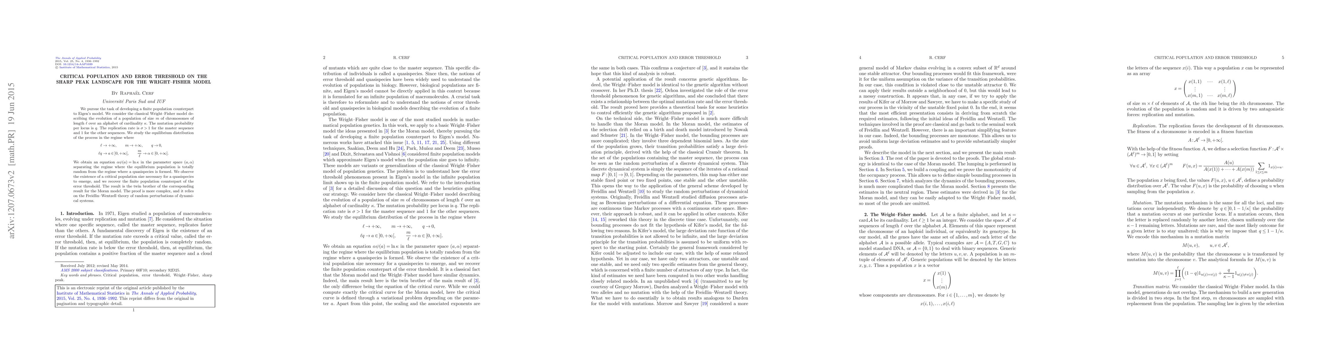 This paper develops a finite population model analogous to Eigen's model for the Wright-Fisher model, identifying a critical population size necessary for quasispecies formation and deriving the finite population error threshold. The proof utilizes the Freidlin-Wentzell theory for random perturbations of dynamical systems.