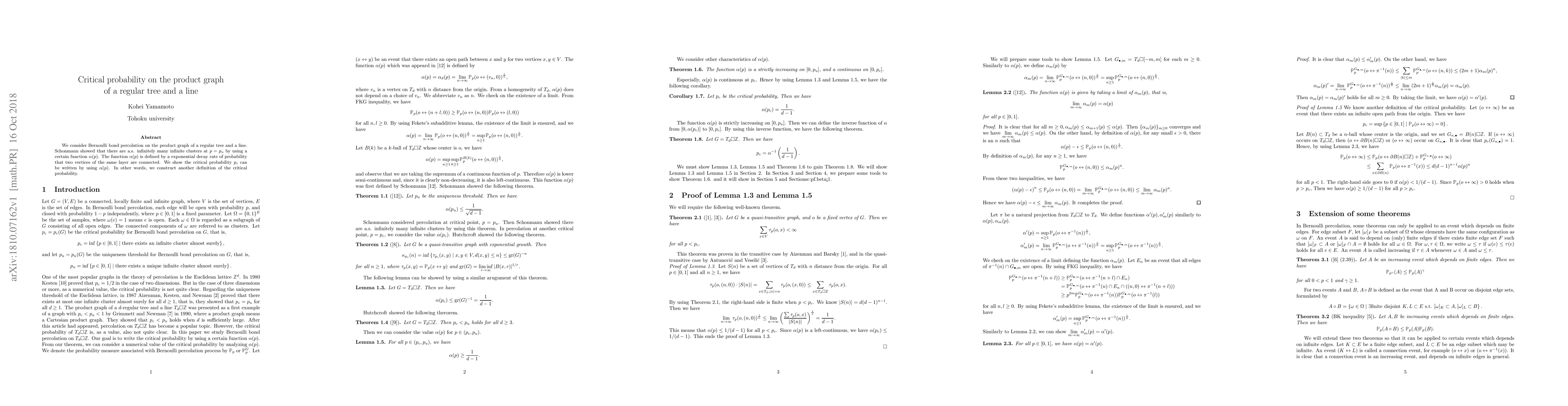 This research explores Bernoulli bond percolation on the product graph of a regular tree and a line, demonstrating that the critical probability $p_c$ can be expressed using the function $\alpha(p)$, which measures the exponential decay rate of the probability that two vertices in the same layer are connected. This provides an alternative definition of the critical probability.