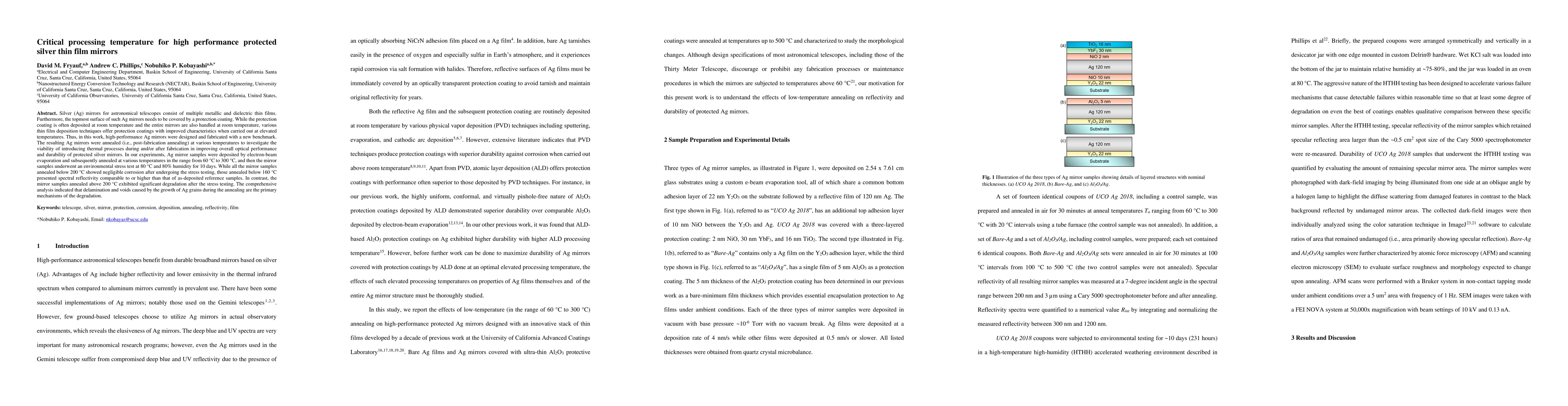 This study investigates the optimal annealing temperature for high-performance protected silver thin film mirrors used in telescopes, finding that annealing below 200°C enhances reflectivity and durability, while temperatures above 200°C lead to significant degradation due to delamination and void formation.
