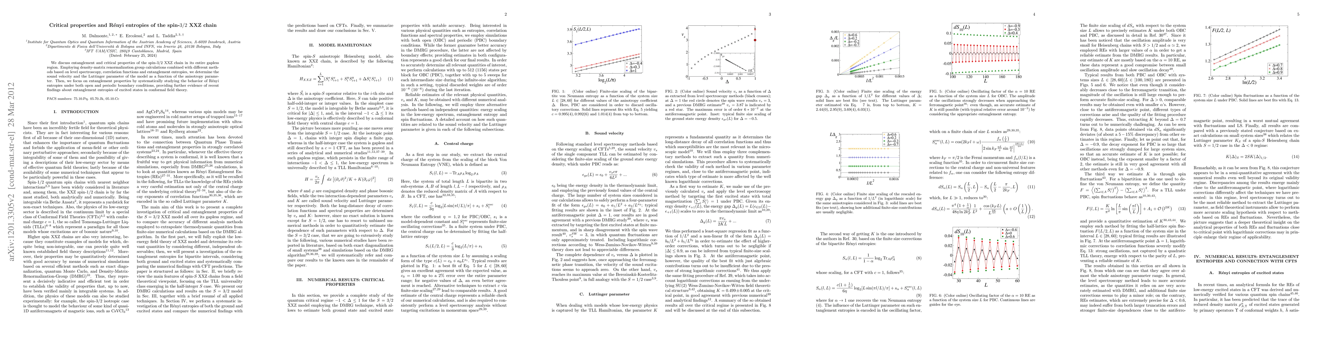 This paper investigates the critical properties and entanglement of the spin-3/2 XXZ chain, determining its sound velocity and Luttinger parameter via density-matrix renormalization group calculations. It also examines Rényi entropies under different boundary conditions, supporting recent insights into entanglement in excited states of conformal field theory.